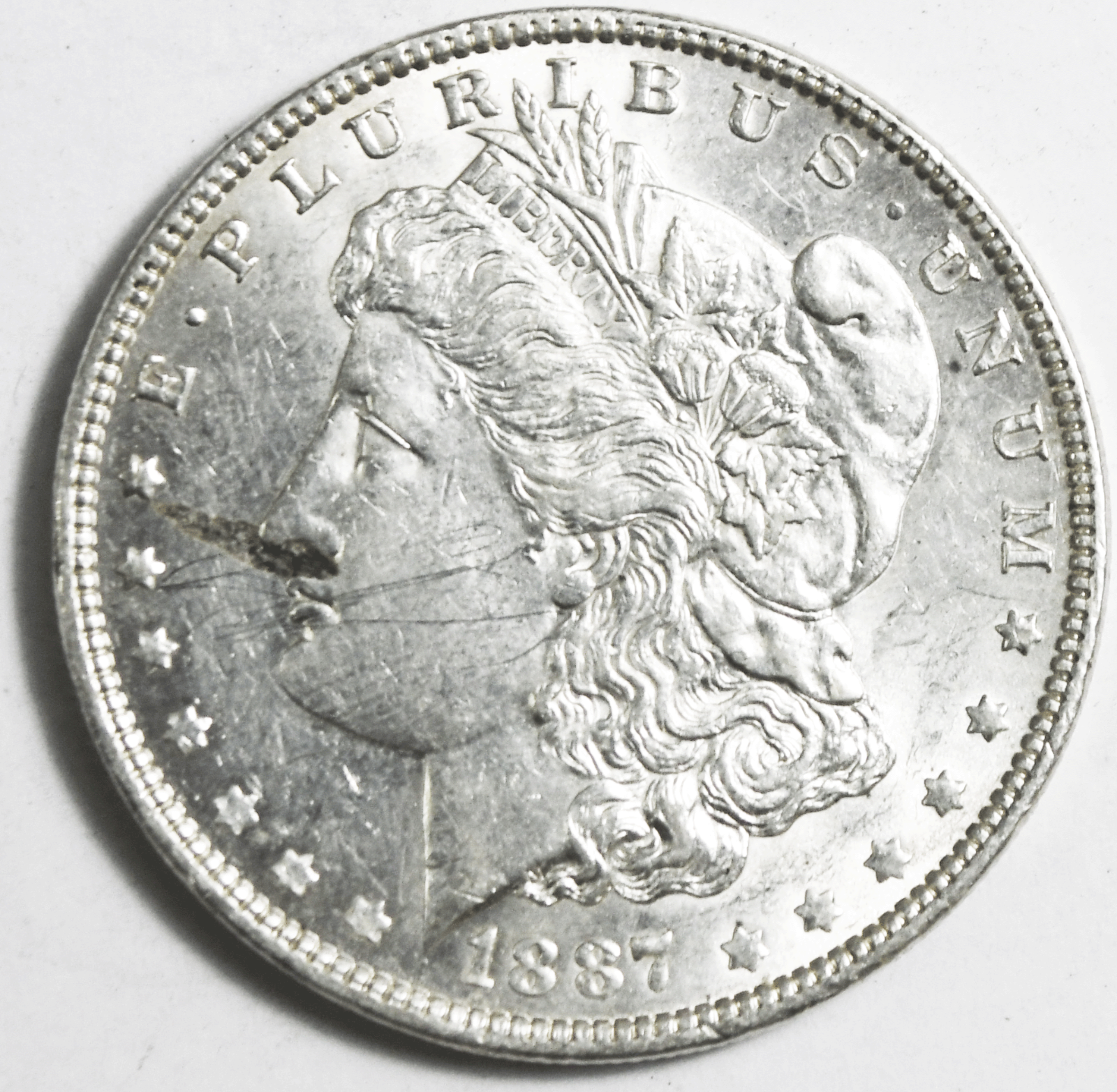1887 $1 Morgan American Silver One Dollar Philadelphia AU Scratches Lamination