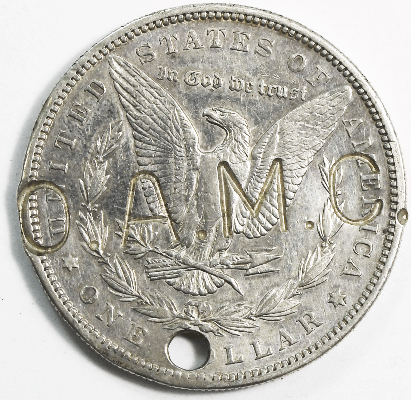 1889 $1 Morgan American Silver One Dollar US Coin Counterstamp O.A.M.C Holed