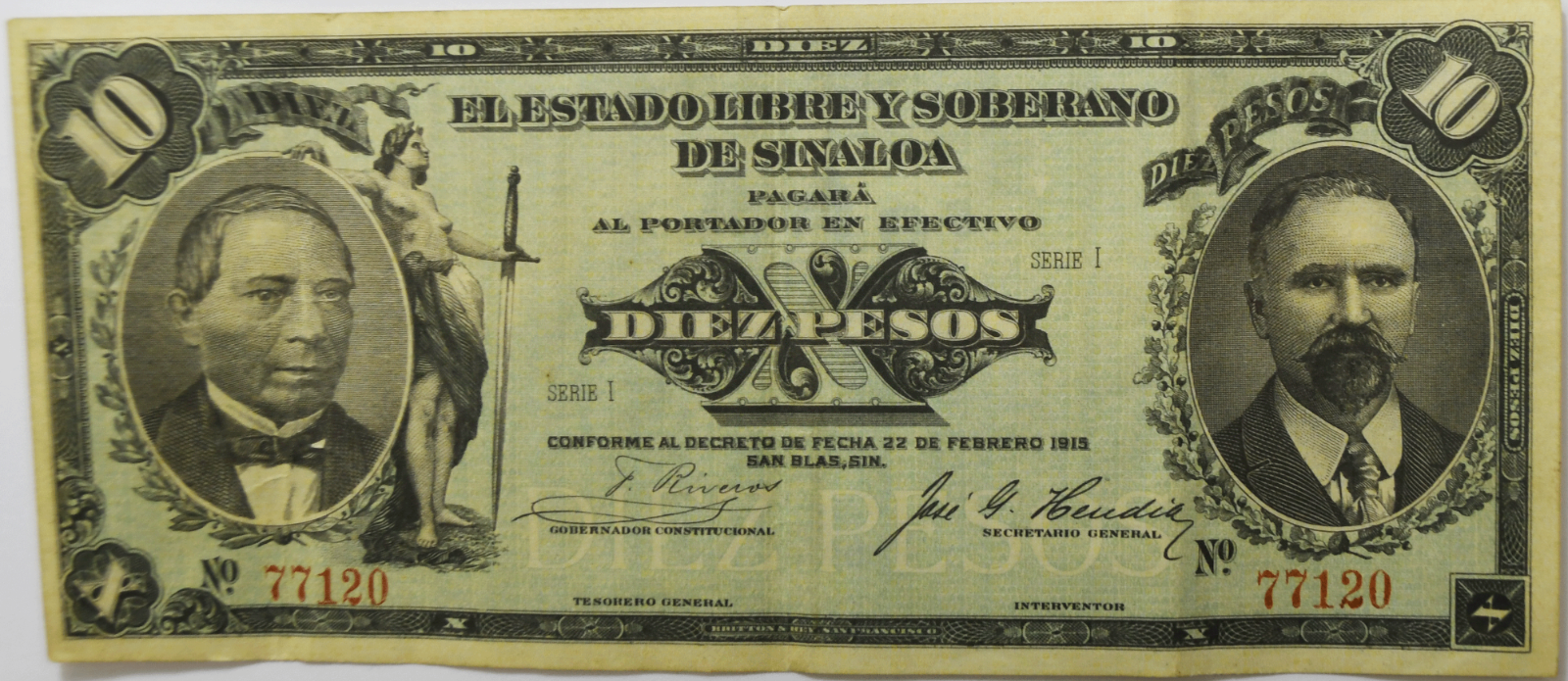 1915 Mexico Revolutionary Sinaloa 10 Ten Pesos Green Large Note 77120