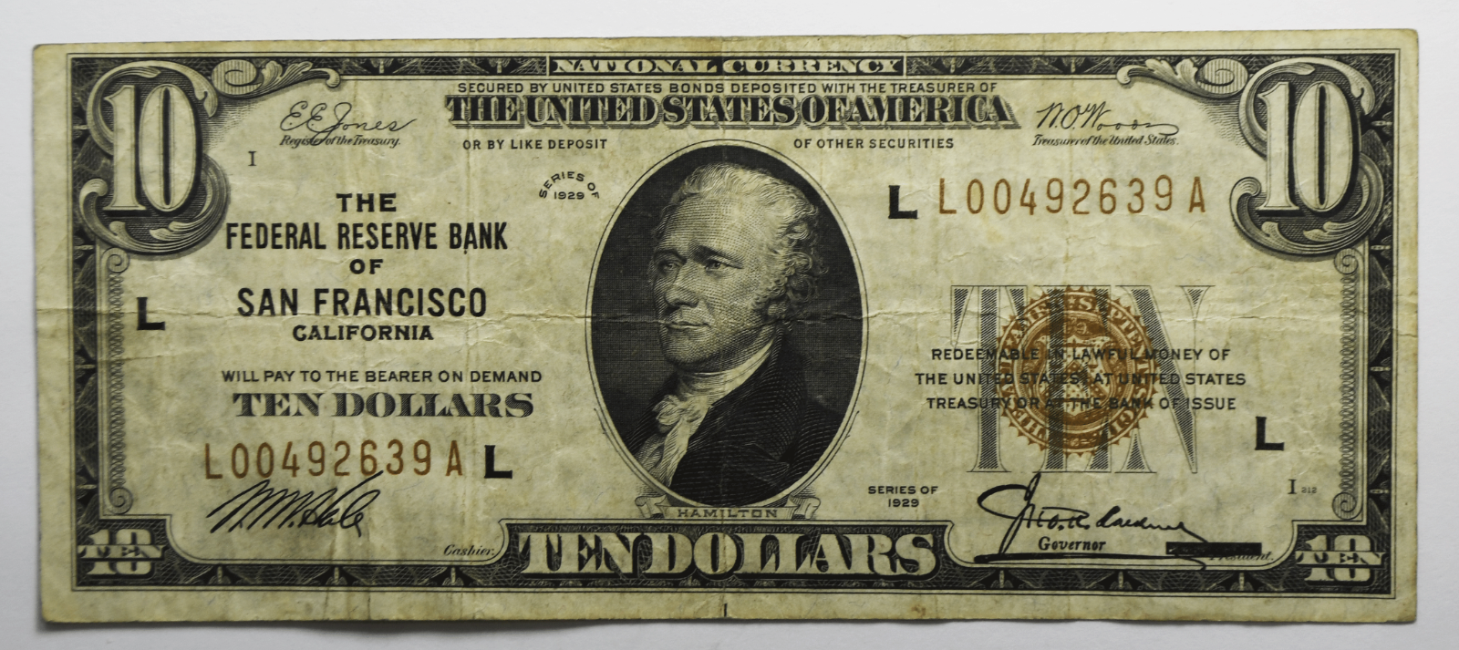 1929 $10 Ten Dollars FRBN Federal Reserve Bank Note SF California L00492639A