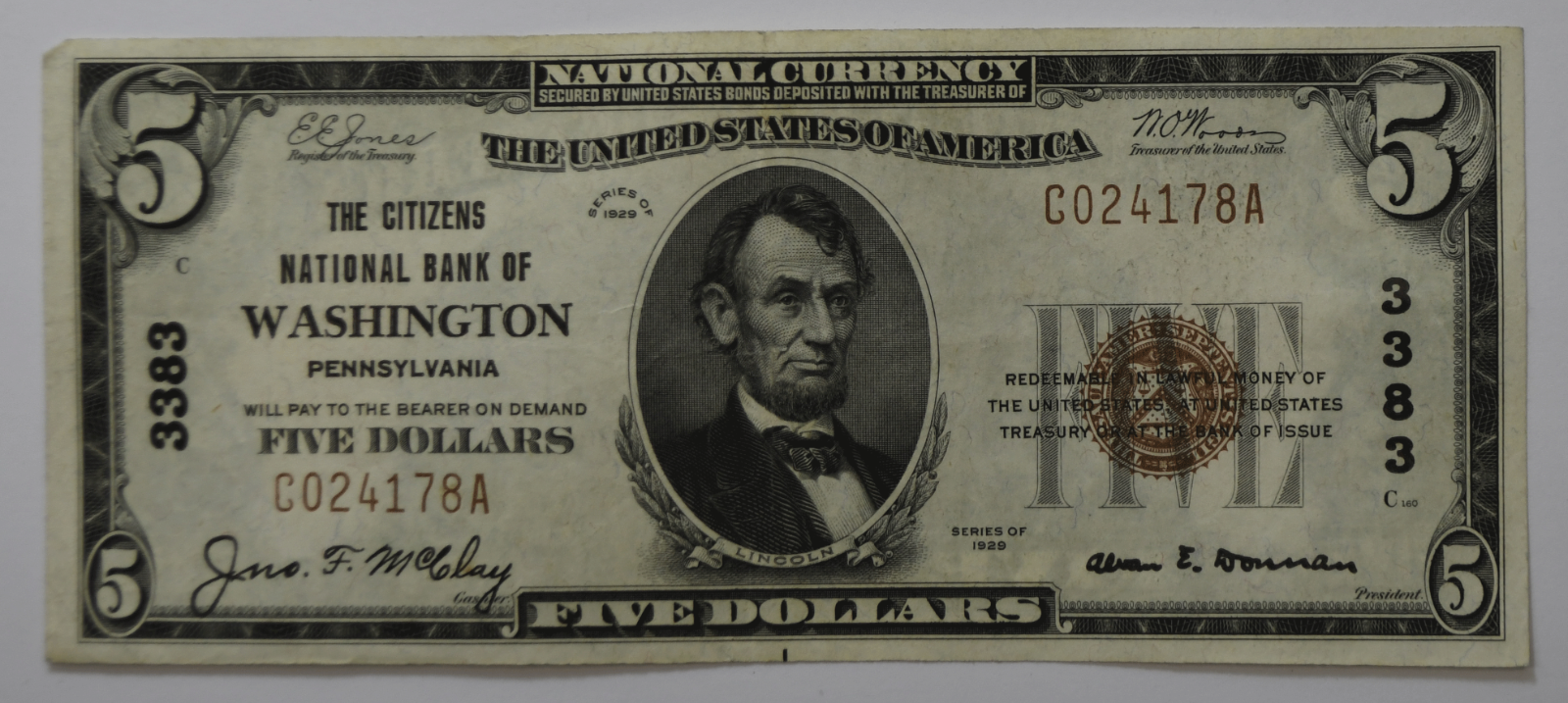 1929 $5 Five Dollars National Currency Note 3383 Washington PA C024178A