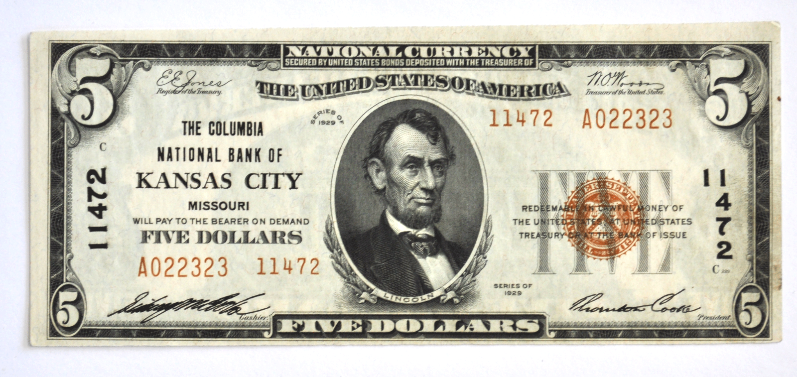 1929 $5 National Currency People NB Columnia NB KC MO Type 2 11472 A022323