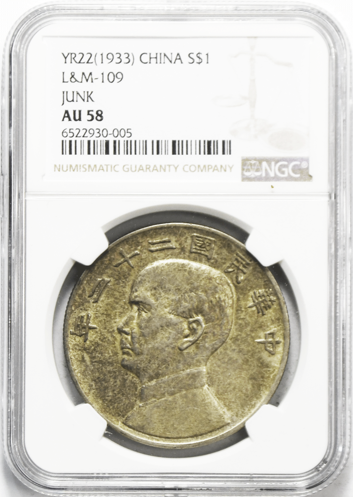 1933 China $1 Silver Dollar Year 22 L&M 109 Junk NGC AU58