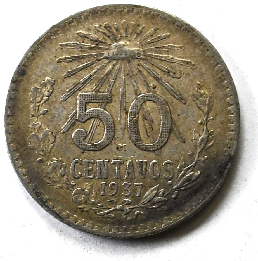 1937 Mexico Estados Unidos Mexicanos Fifty 50 Centavos Silver Coin KM# 447