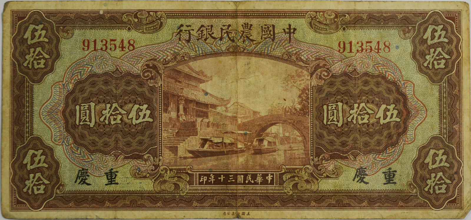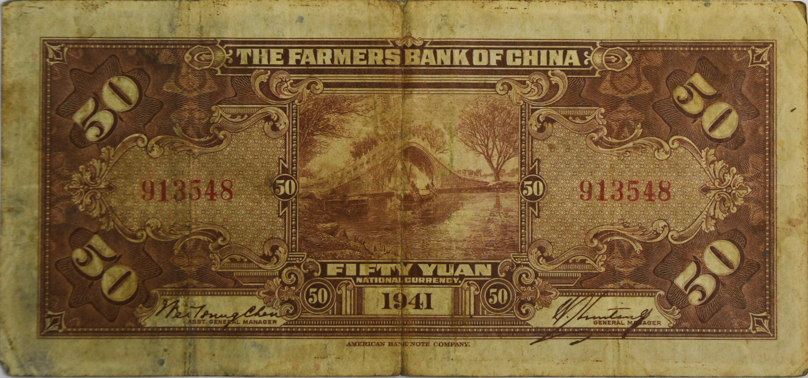 1941 50 Fifty Yuan Farmers Bank of China Banknote 913548