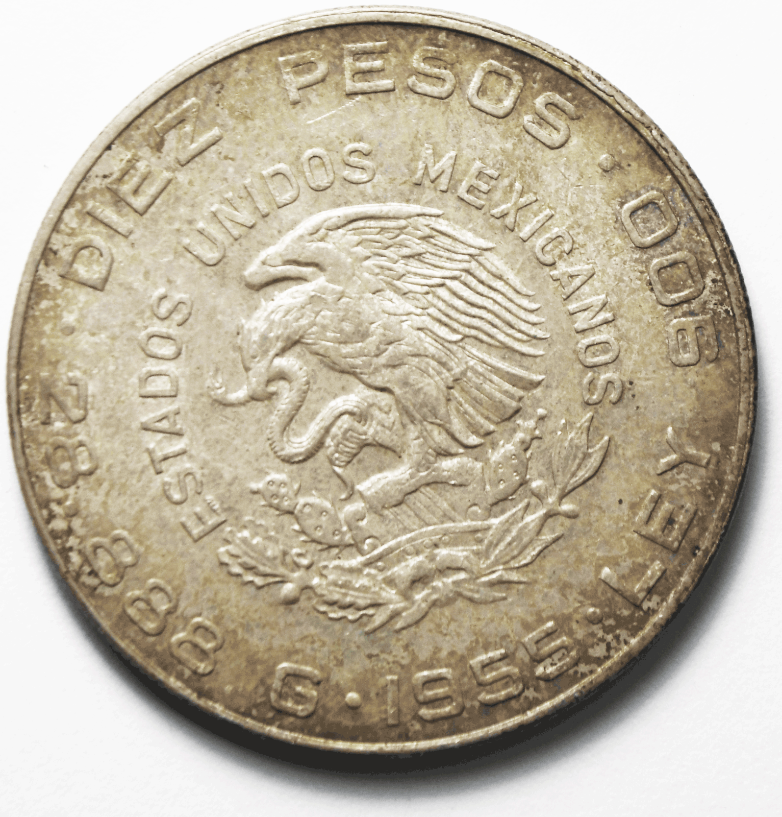 1955 Mexico Estados Unidos Mexicanos Ten 10 Diez Pesos Silver Coin KM#474