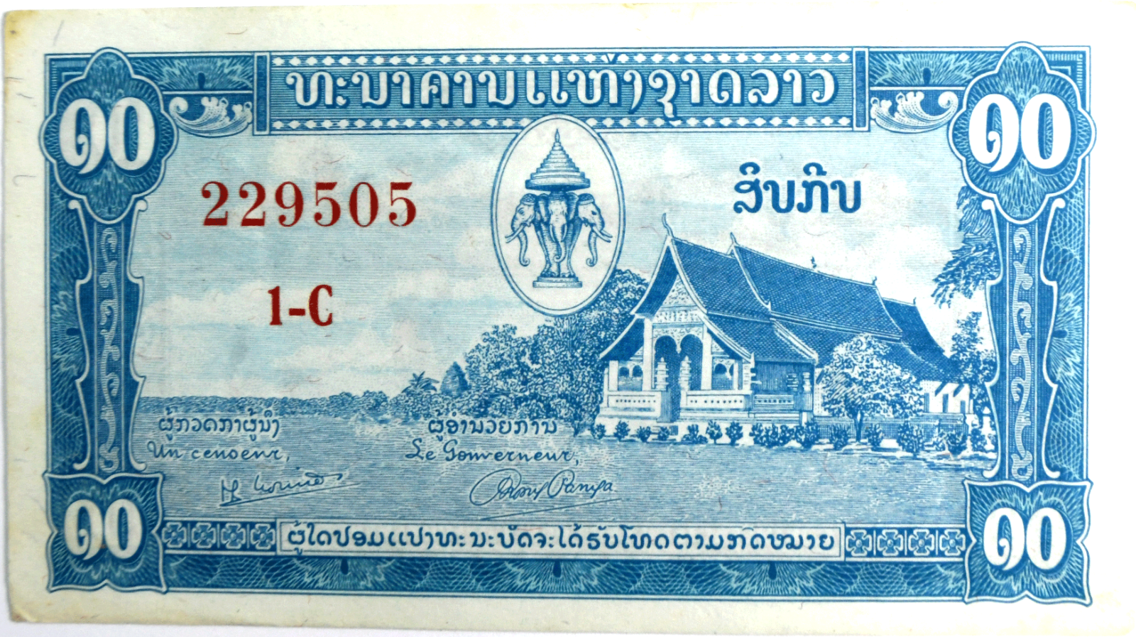 1957 Lao 10 Kip Banknote AU Laos 229505 1-C
