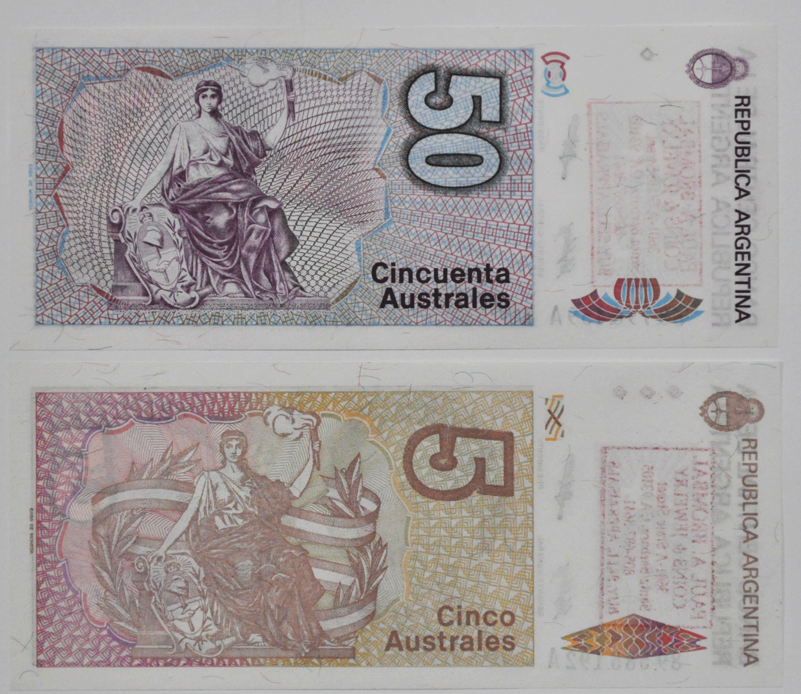 1986-89 ND Argentina Uncirculated 5 & 50 Australes Notes Counter Stamped
