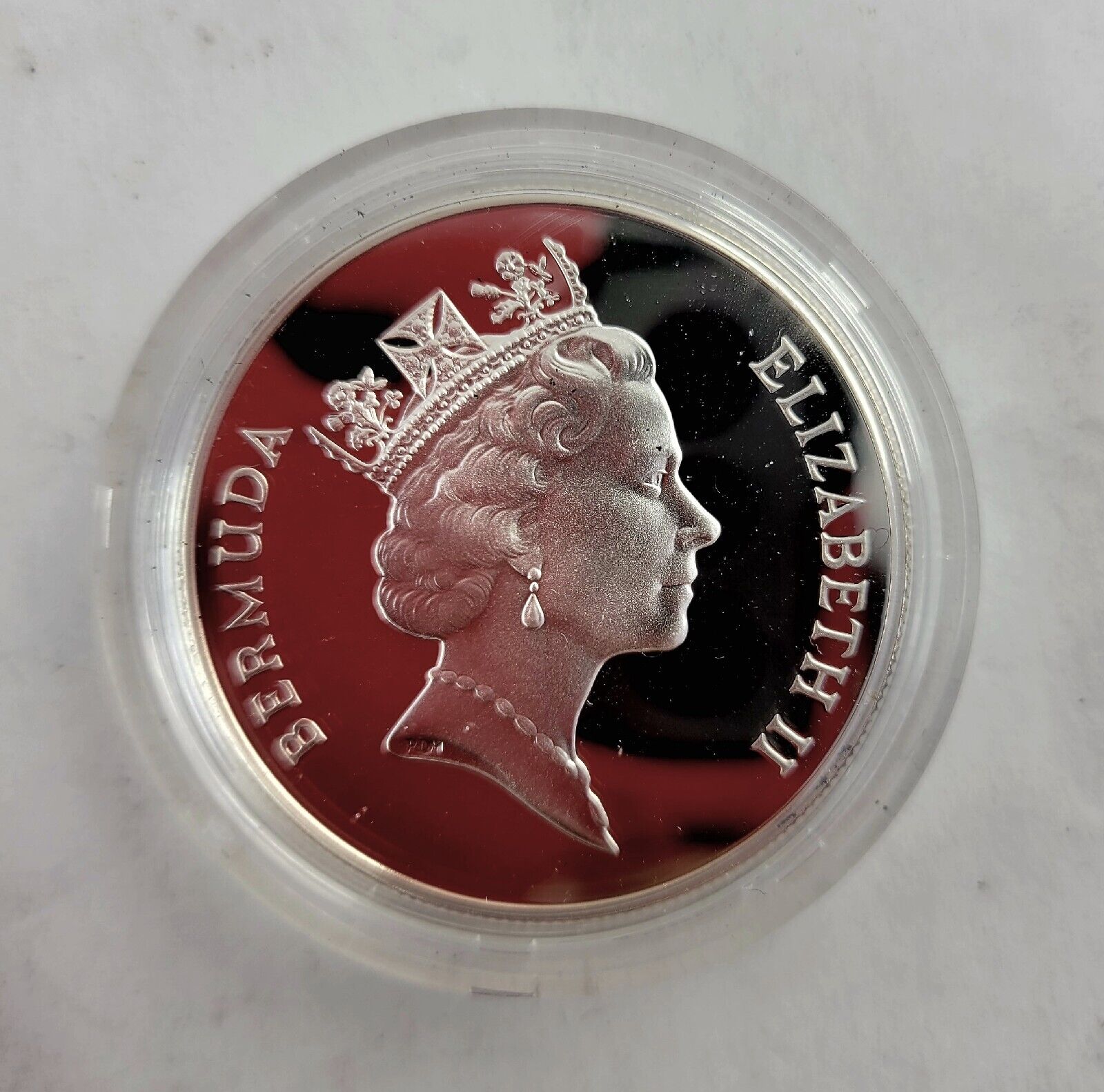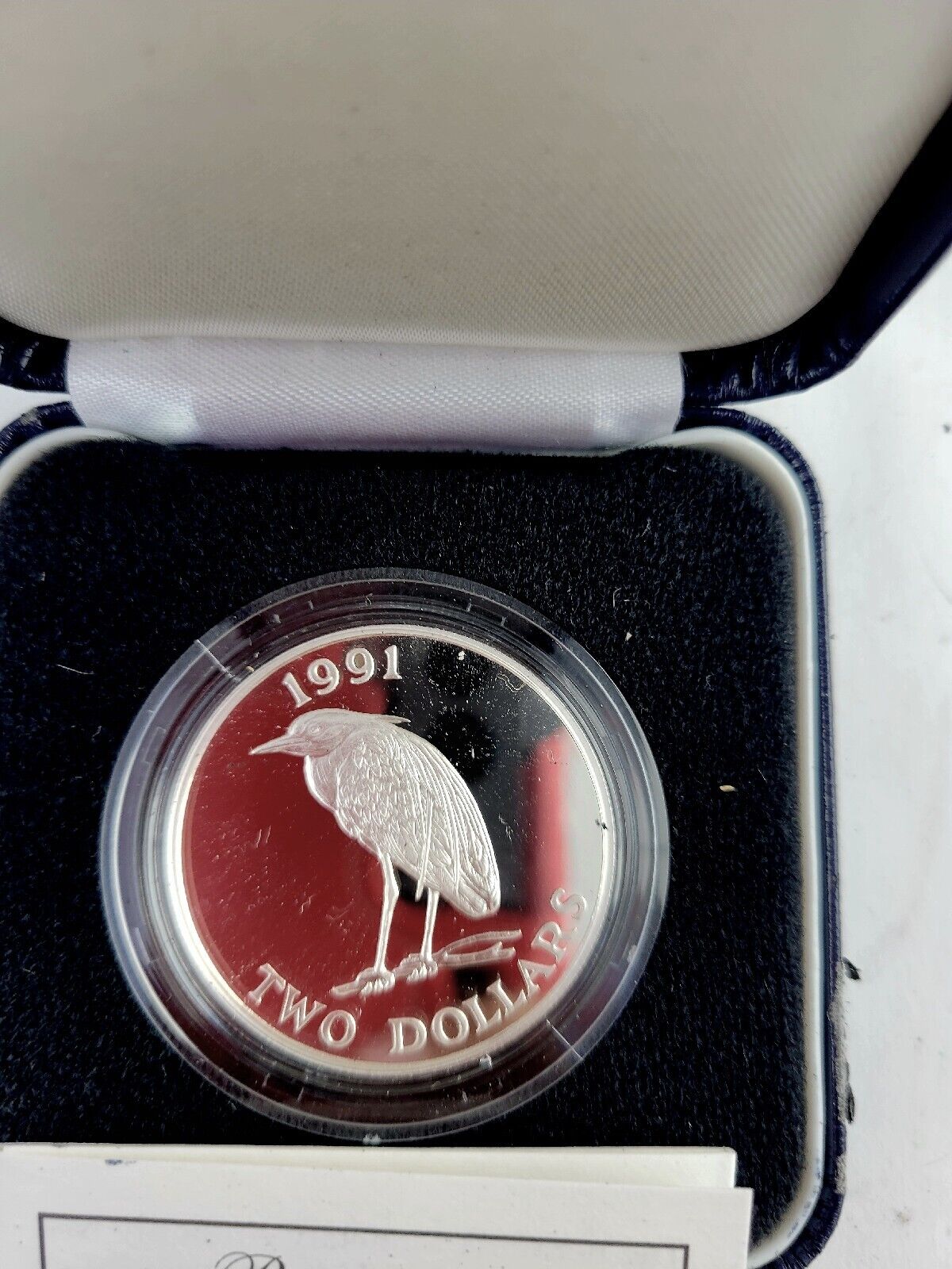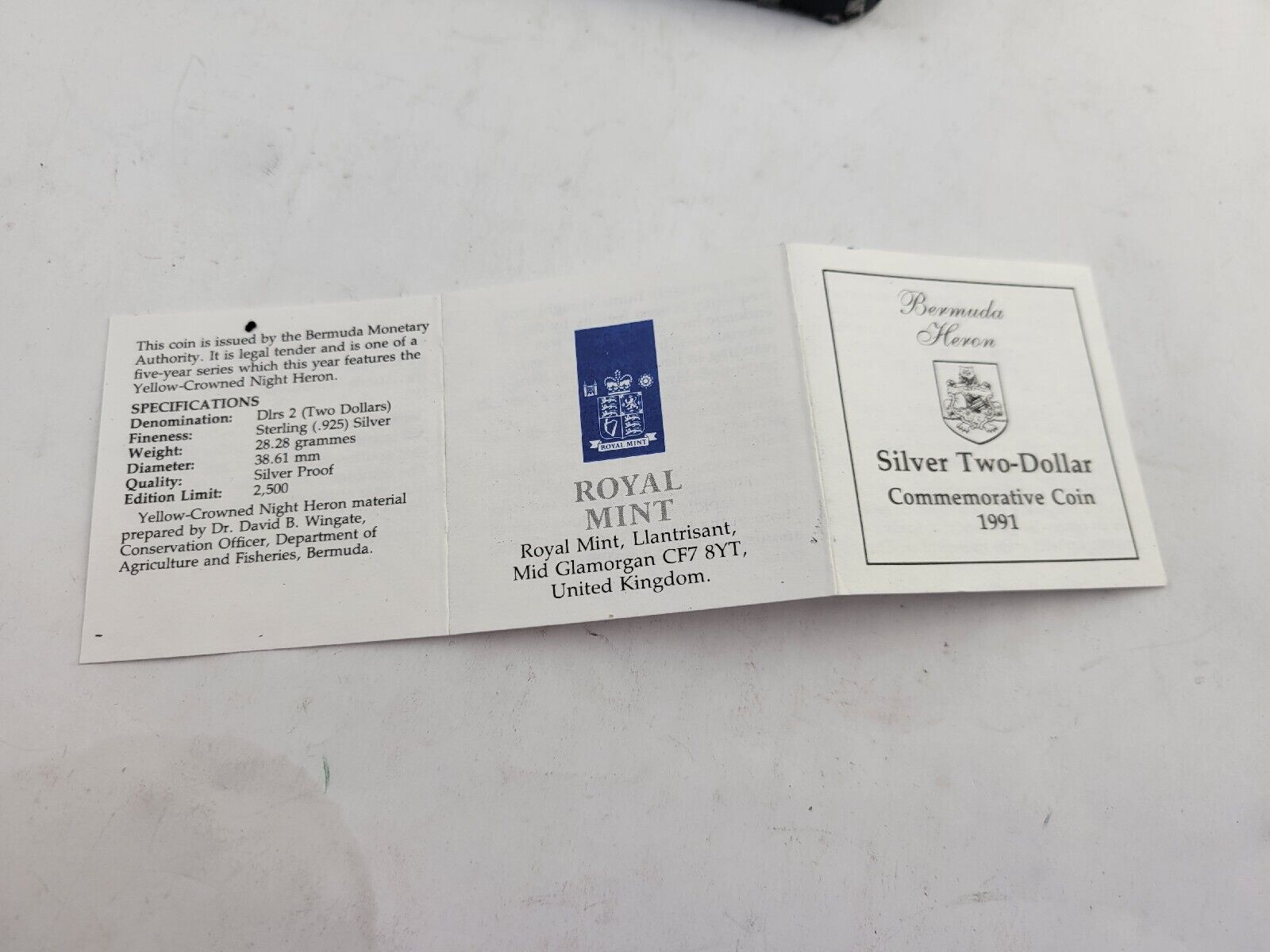 1991 Bermuda Silver 2 Dollars Yellow Crowned Night Heron. The box is really worn but the coin and Paperwork are in good shape