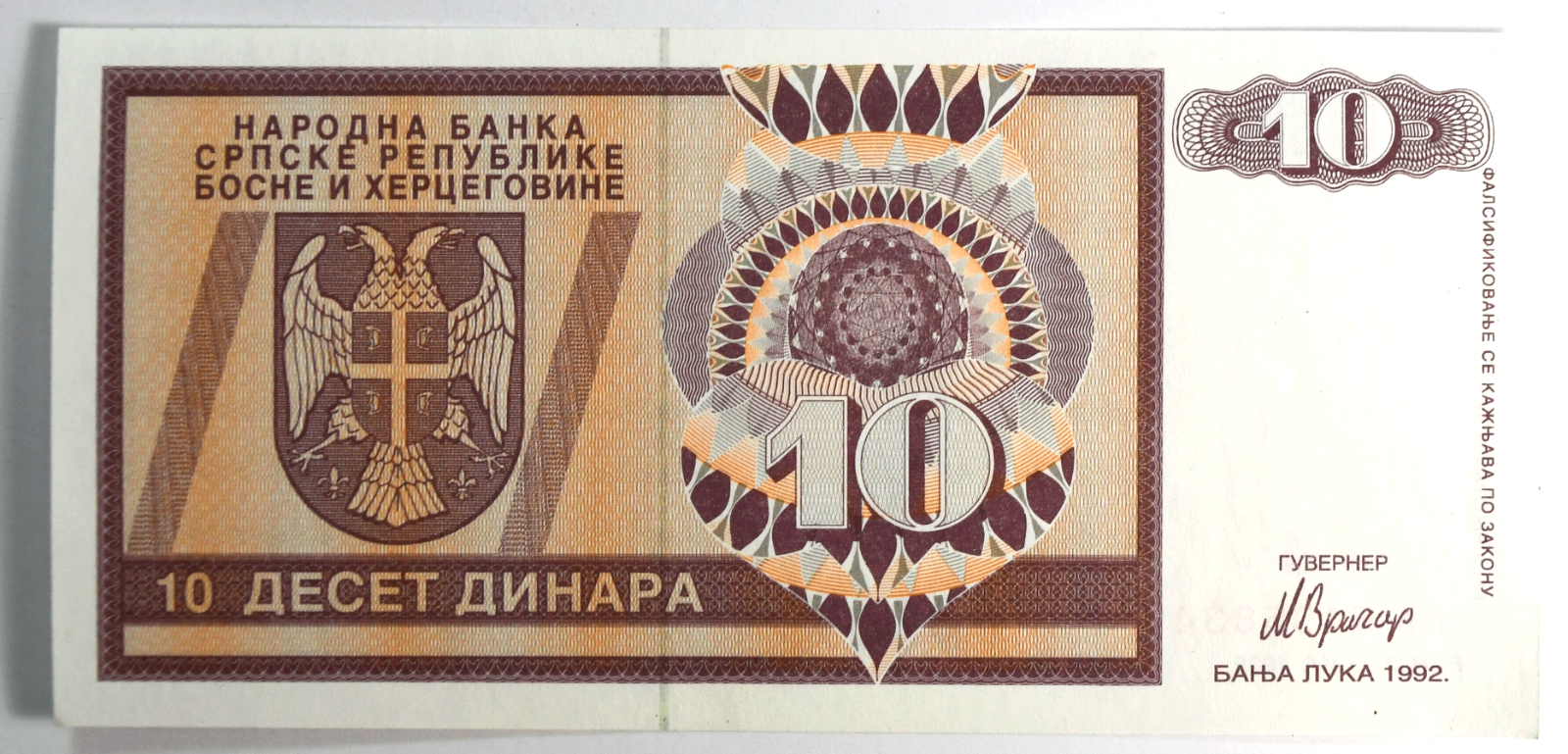 1992 Bosnia Serbian Republic 10 Dinara Banja Luka AA 5405834 Uncirculated