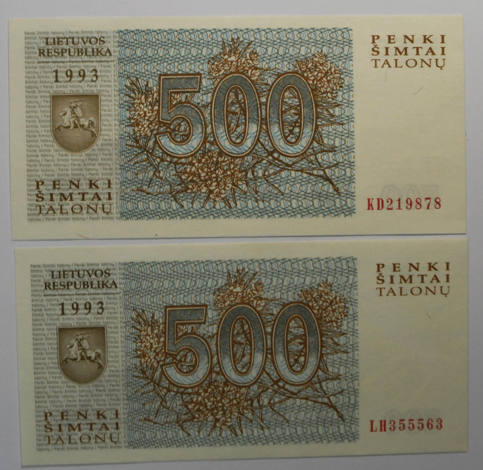 1993 Lithuania 500 Five Hundred Talonu Uncirculated Banknotes KD219878 LH355563