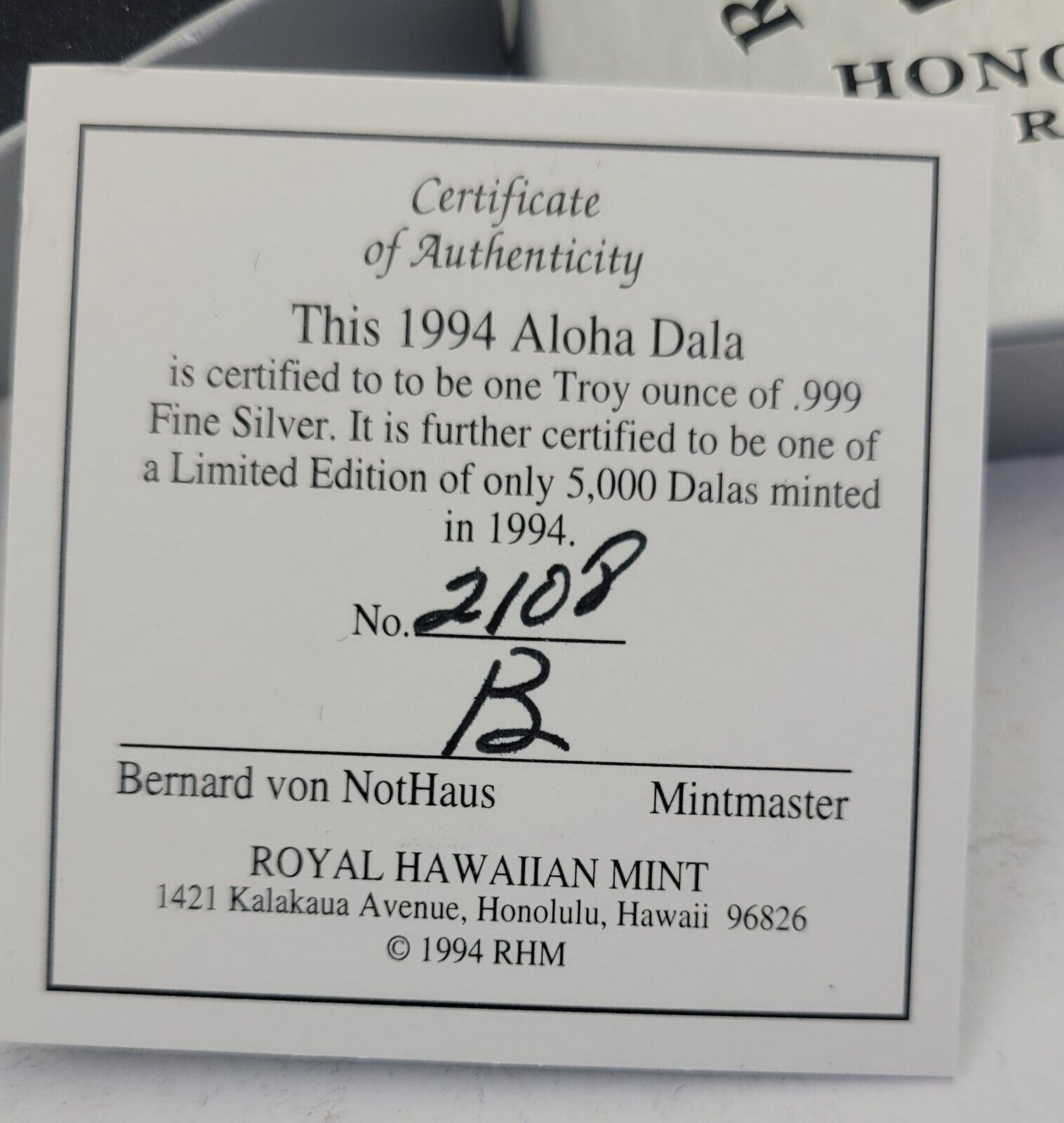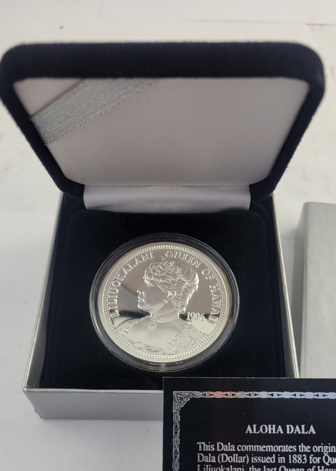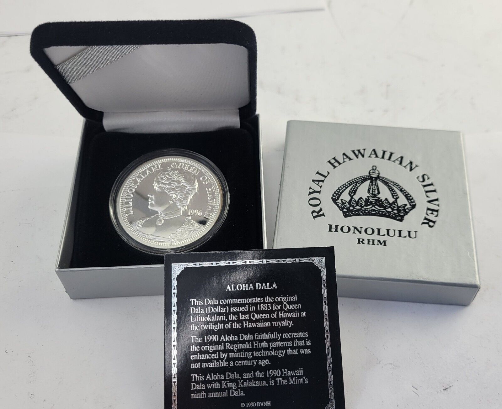 1996 Aloha Dala Queen Liliuokalani RHM Mint 1oz. Fine Silver .999 Boxed w/COA
