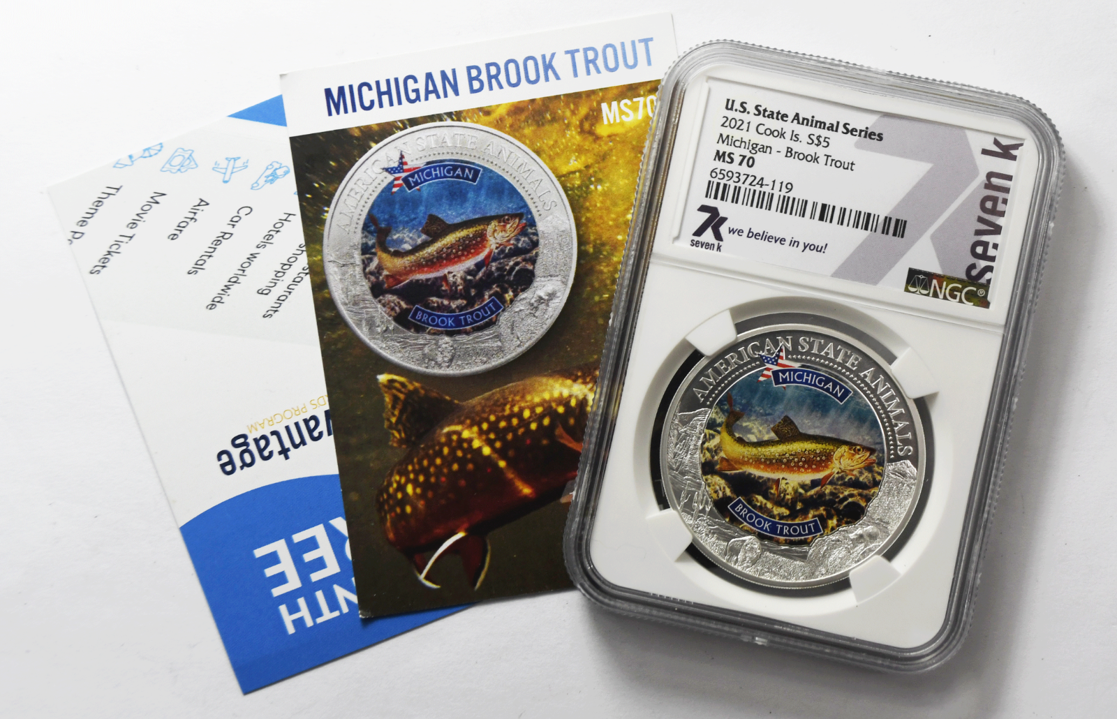 2021 $5 Cook Is Animal Series 7k w Card NGC MS70 Michigan Brook Trout