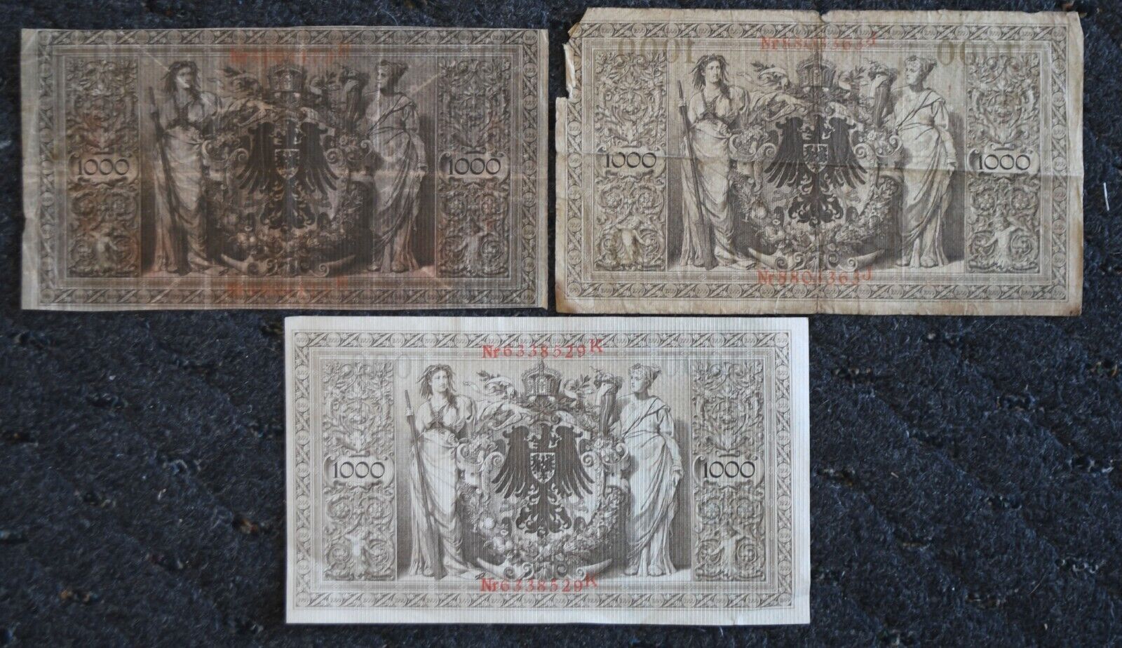 3- 1910 Germany 1,000 One Thousand Mark Reichsbanknotes