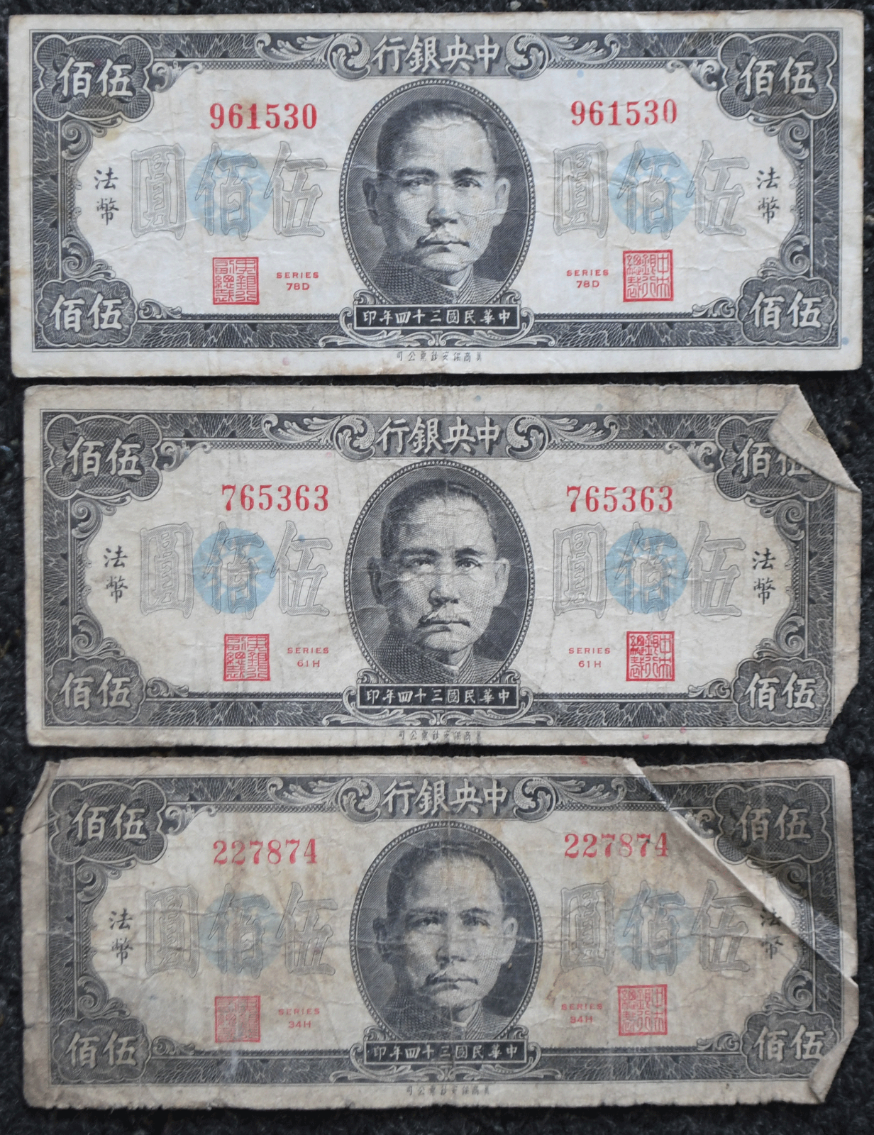 3- 1945 China Republic 500 Yuan Banknotes 961530 765363 227874