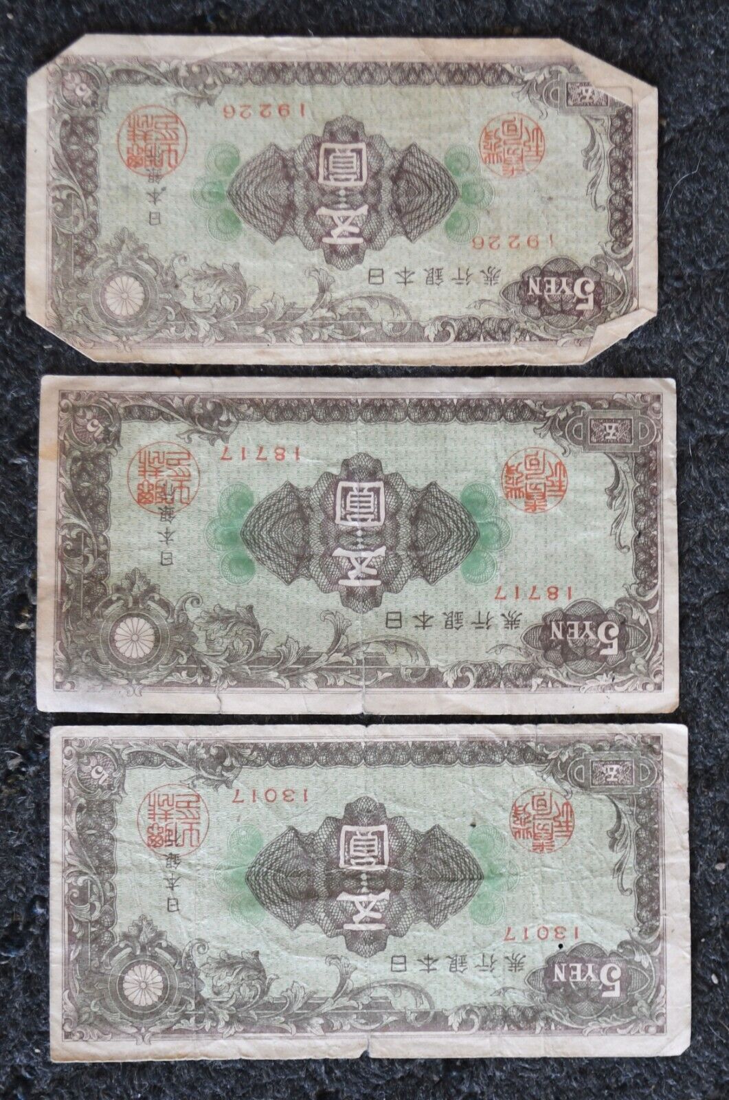 3 1946 Bank of Japan 5 Five Yen Banknotes 13017 18717 19226