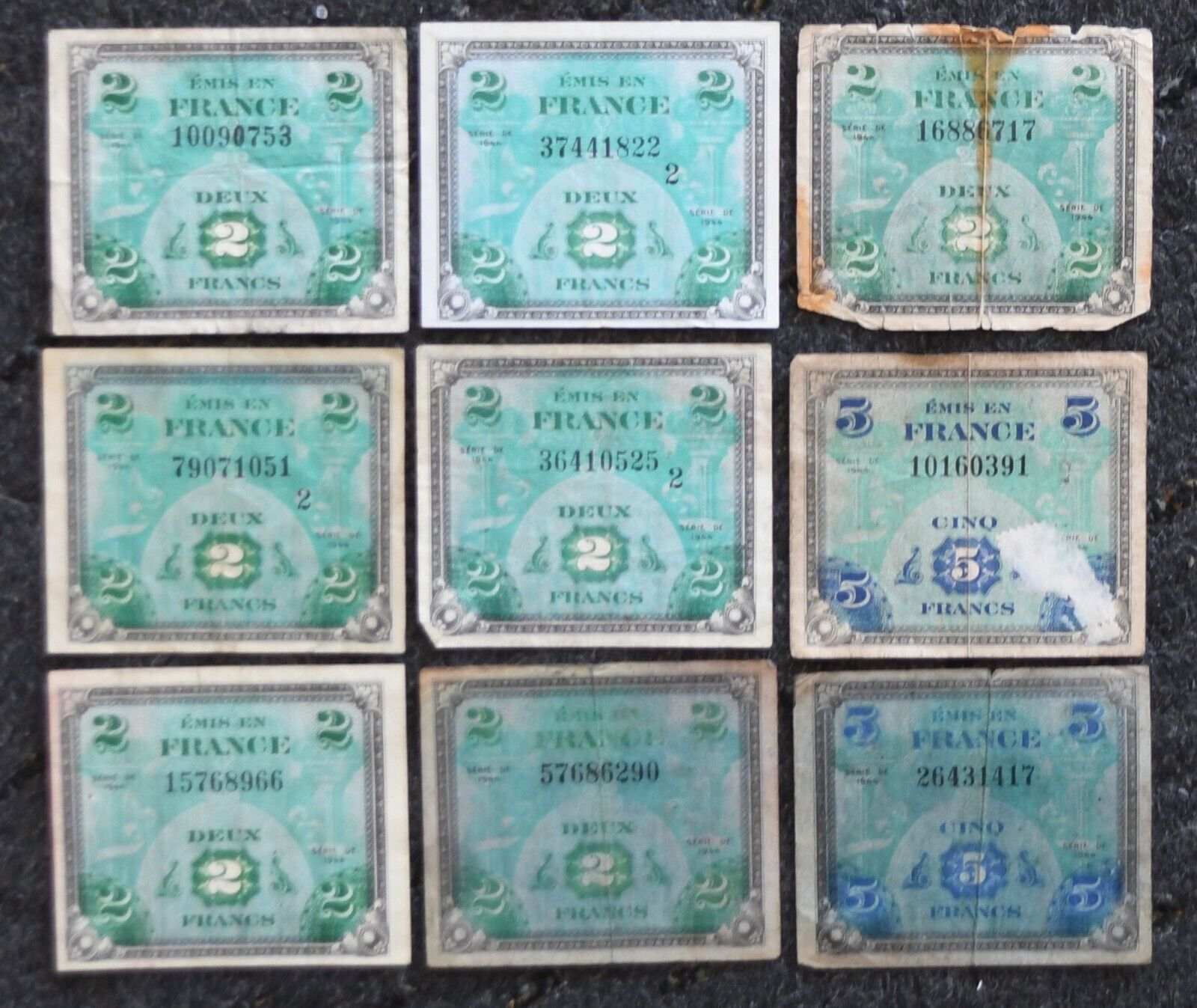 9- France WWII Allied Military Currency Notes 2 & 5 Francs 1944
