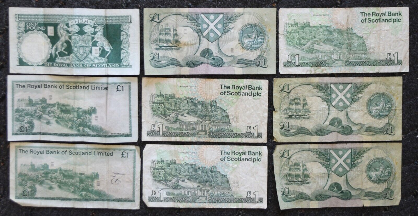 9 Royal Bank of Scotland One Pound Banknotes 1972-1992