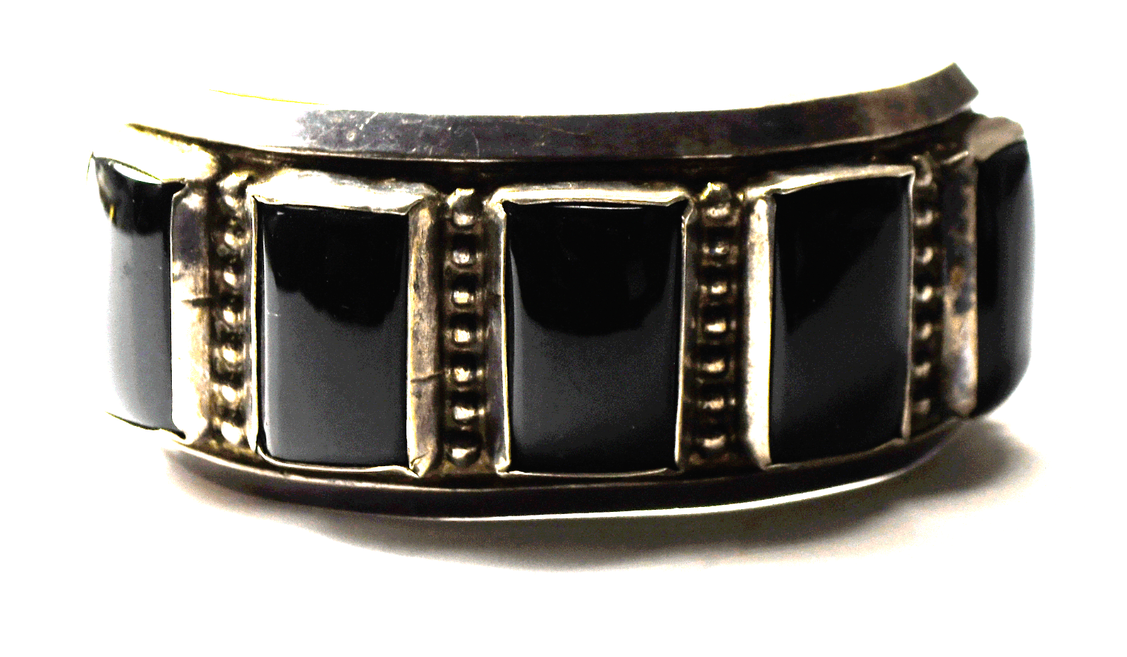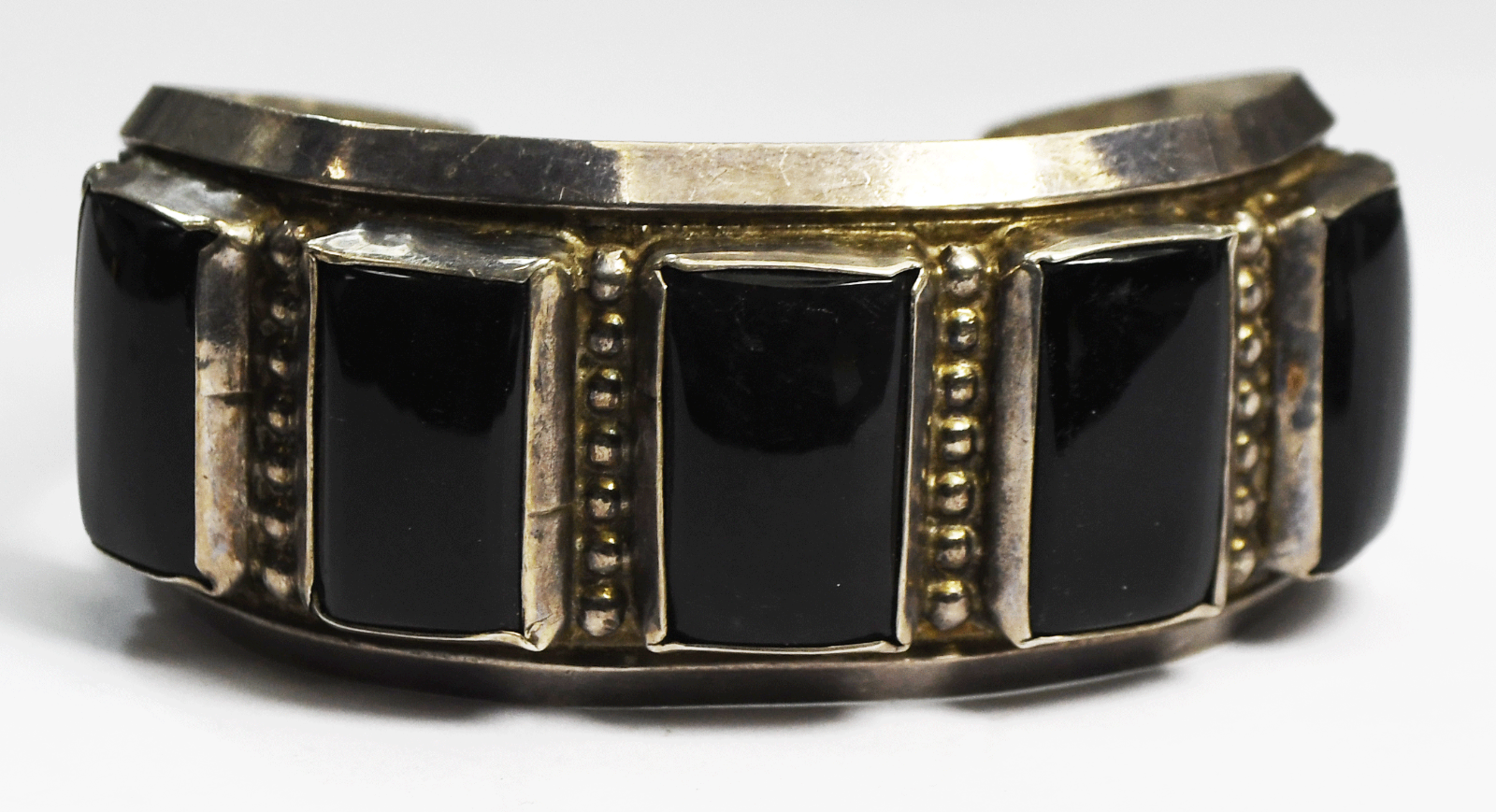 Antique Sterling 3 Bar Sandcast Rectangle Onyx Cuff Bracelet 6" Wrist 51g