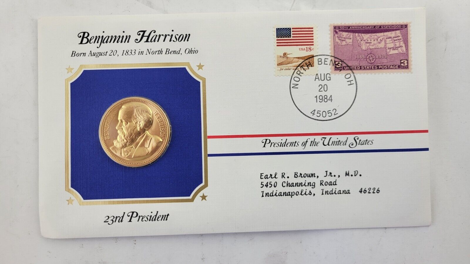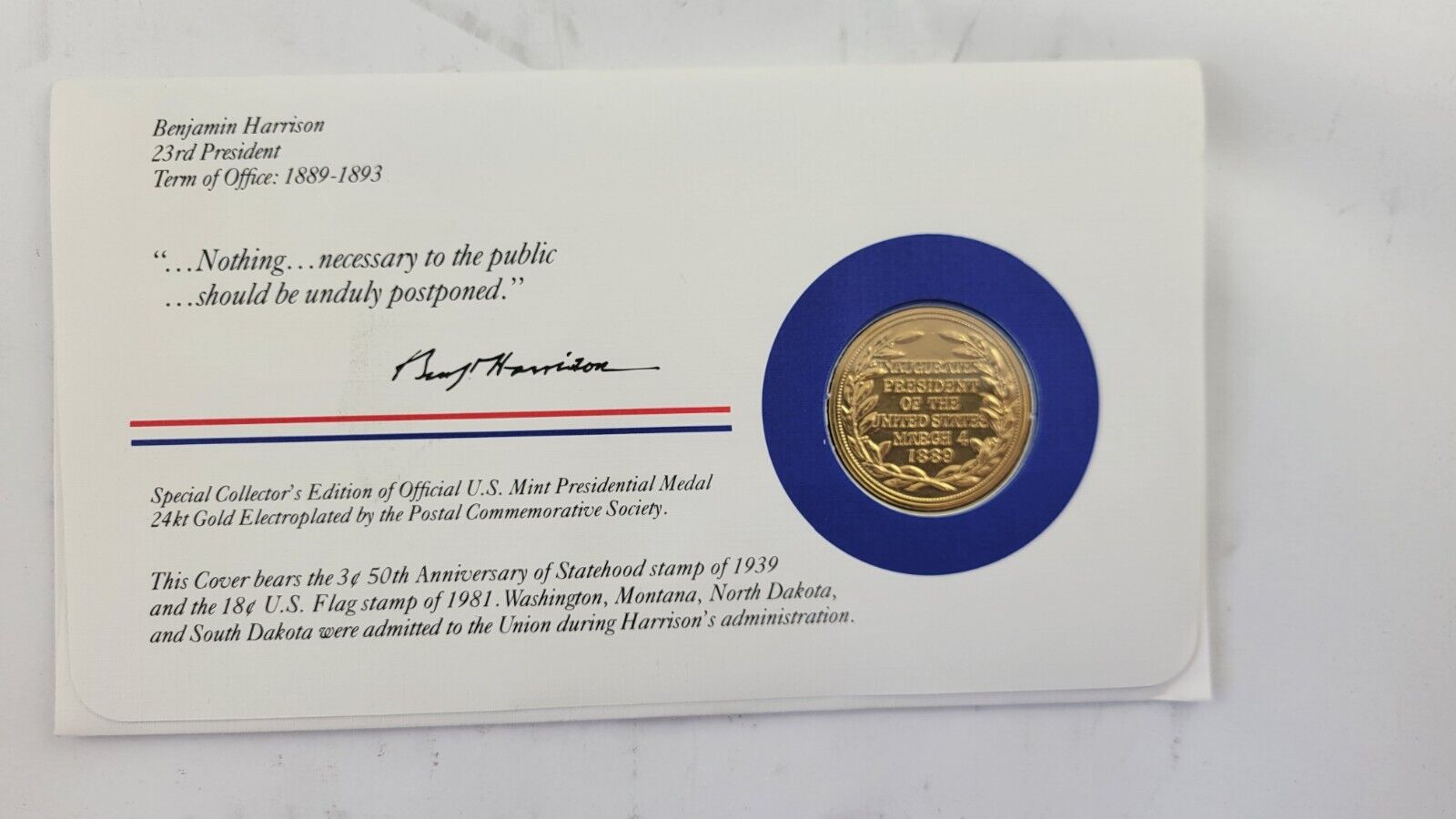 B Harrison Presidential Covers Medal Postal Commemorative Society Gold Plated