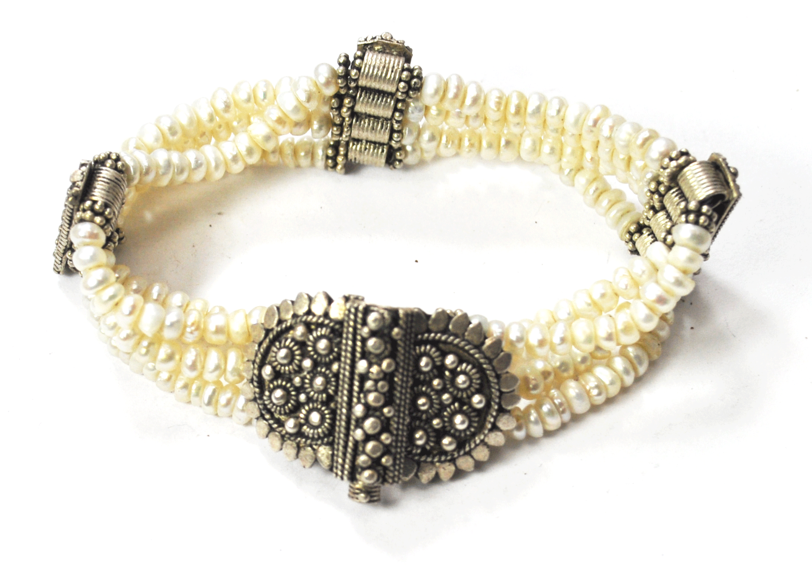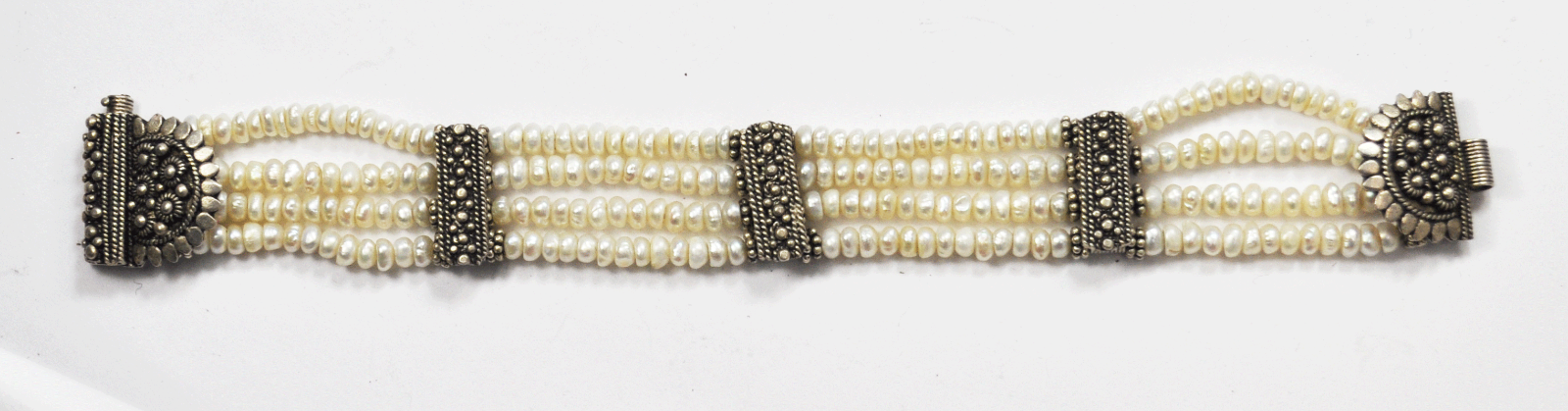 Silver Plated Floral Sunflower Fresh Water Pearl 4 Strand Bracelet 7"