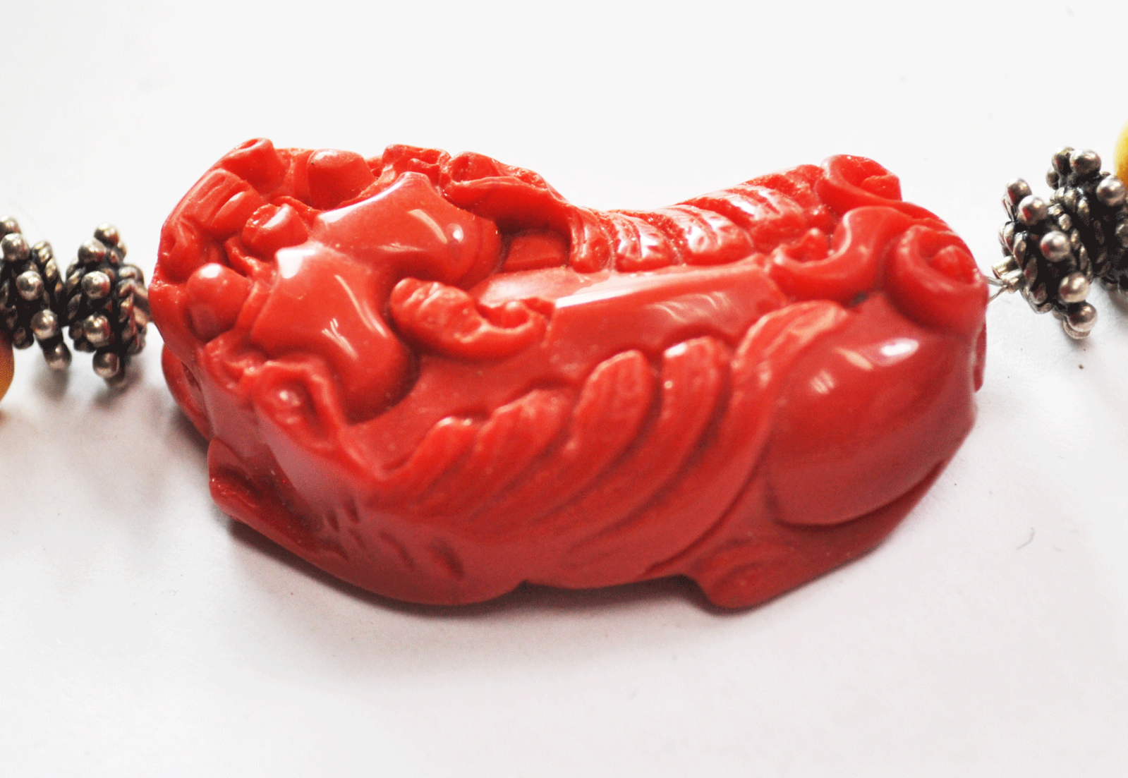 Sterling 10mm Amber Bead 18.25" Necklace Carved Coral Dragon Pendant 25mmX42mm