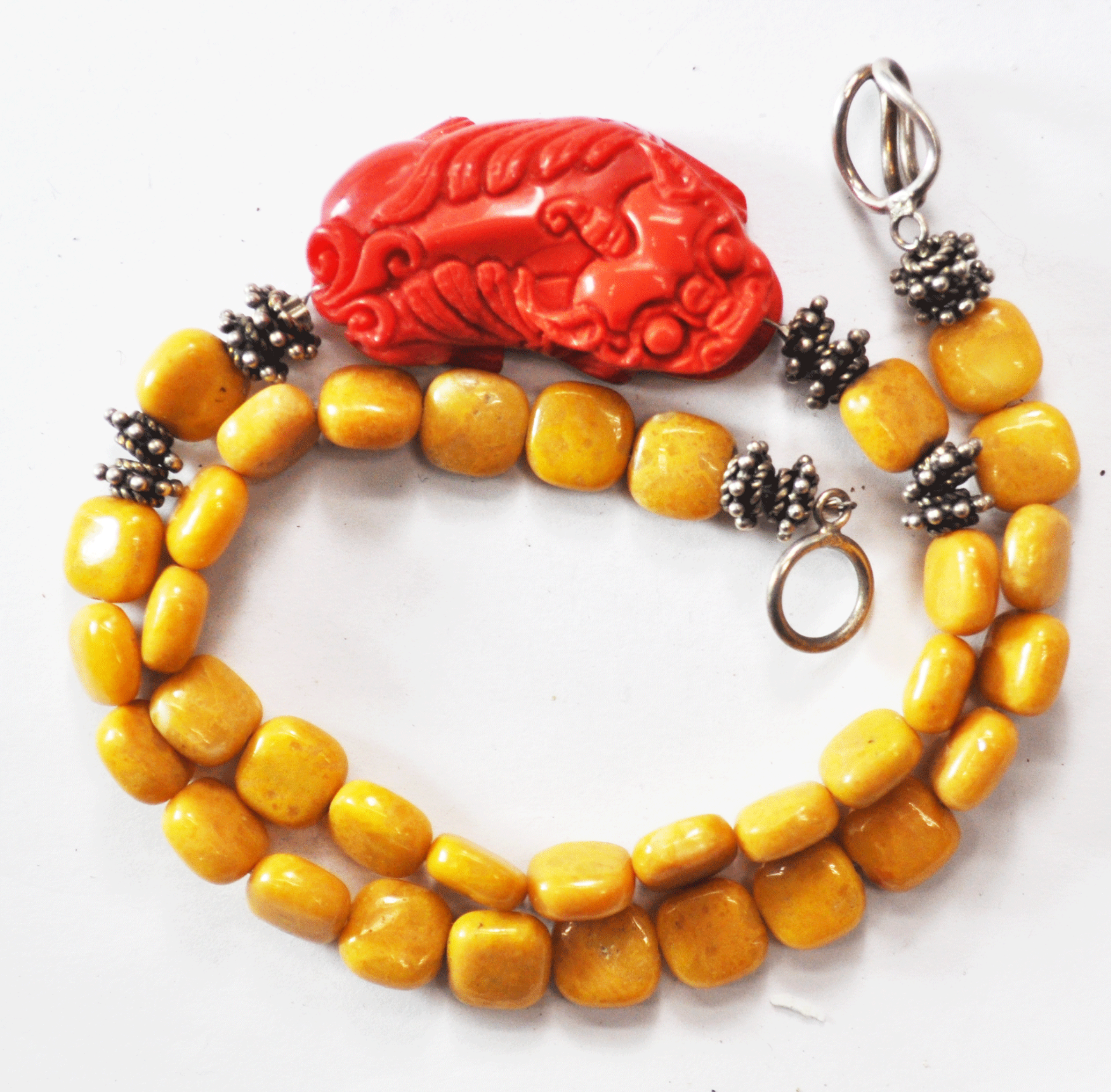 Sterling 10mm Amber Bead 18.25" Necklace Carved Coral Dragon Pendant 25mmX42mm