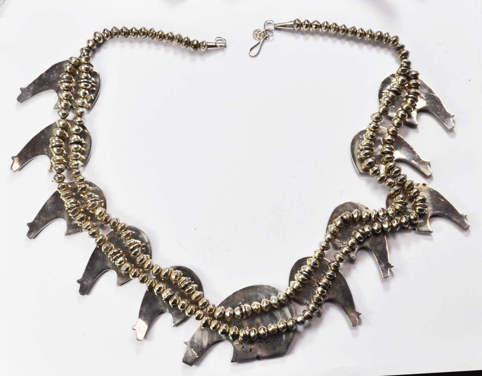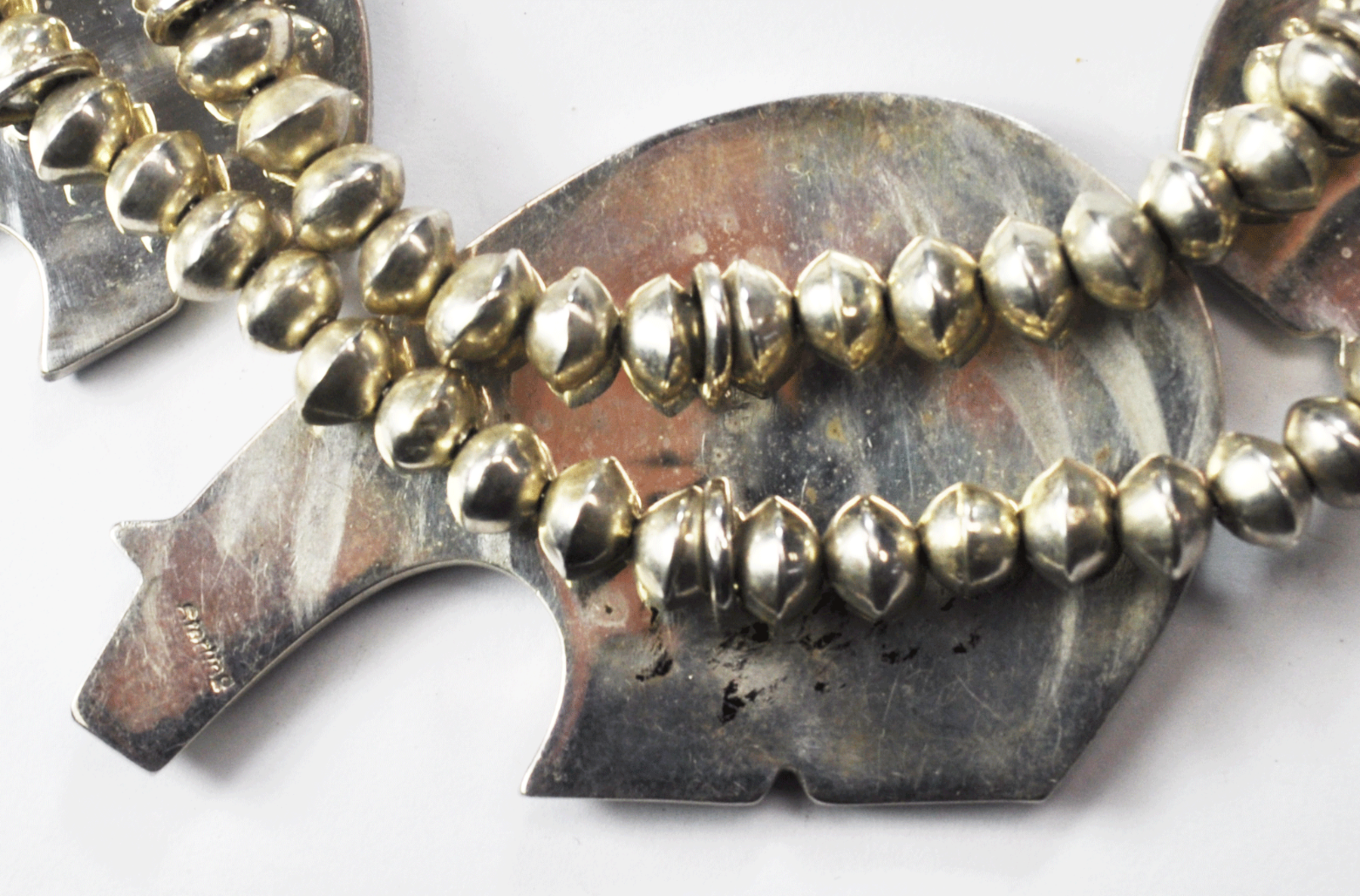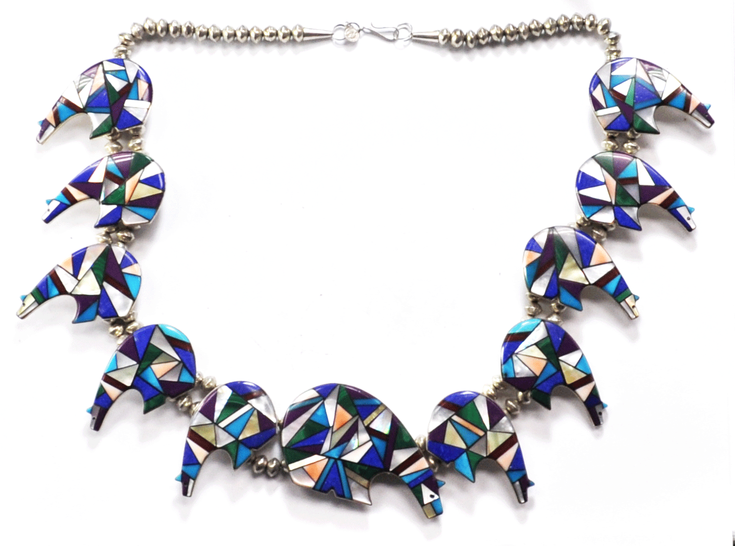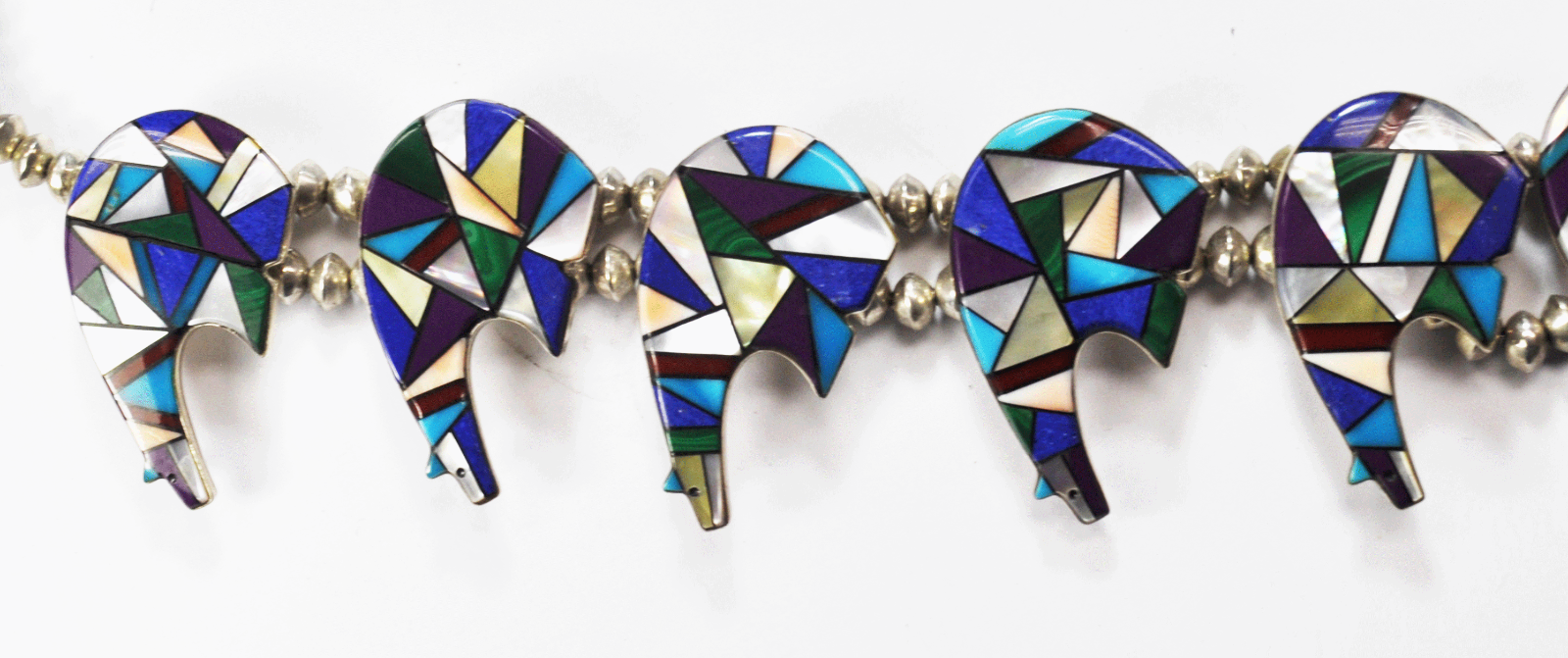 Sterling 11 Bear Colorful Mosaic Inlay Squash Blossom 23" 7mm Bead 2 Strand