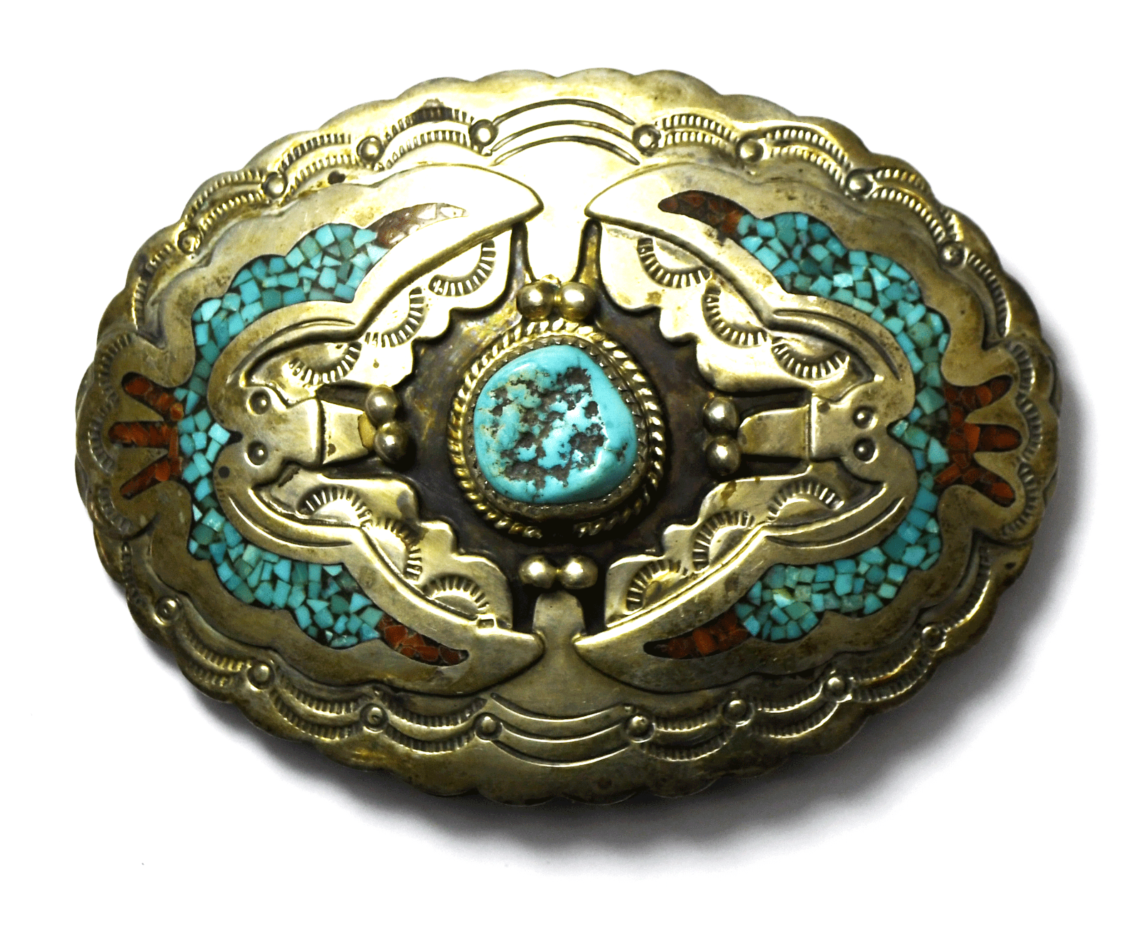 Sterling B. Een Turquoise Chunk Coral Chip Inlay Buckle 3.5" x 2.5" 36mm Belt