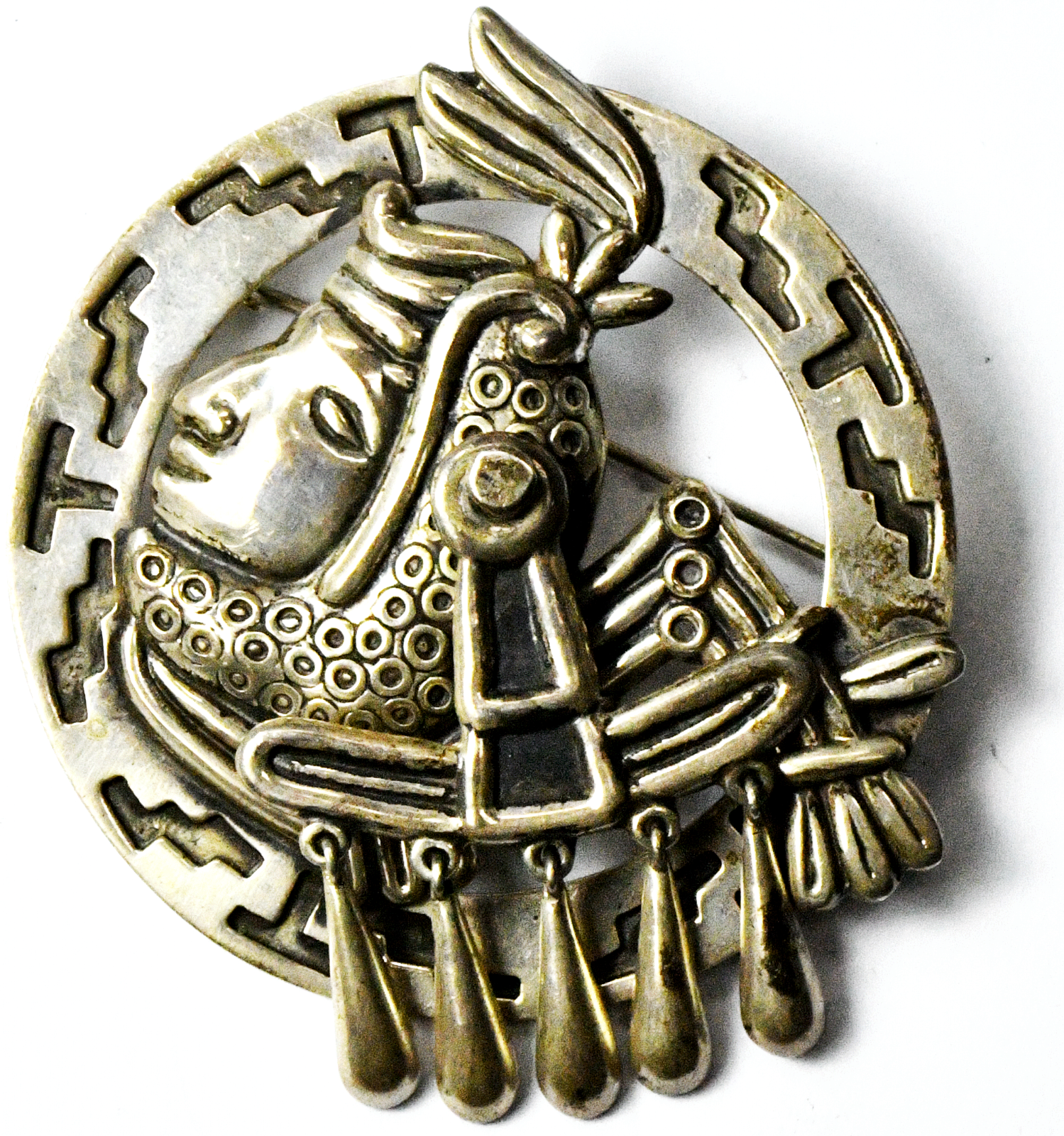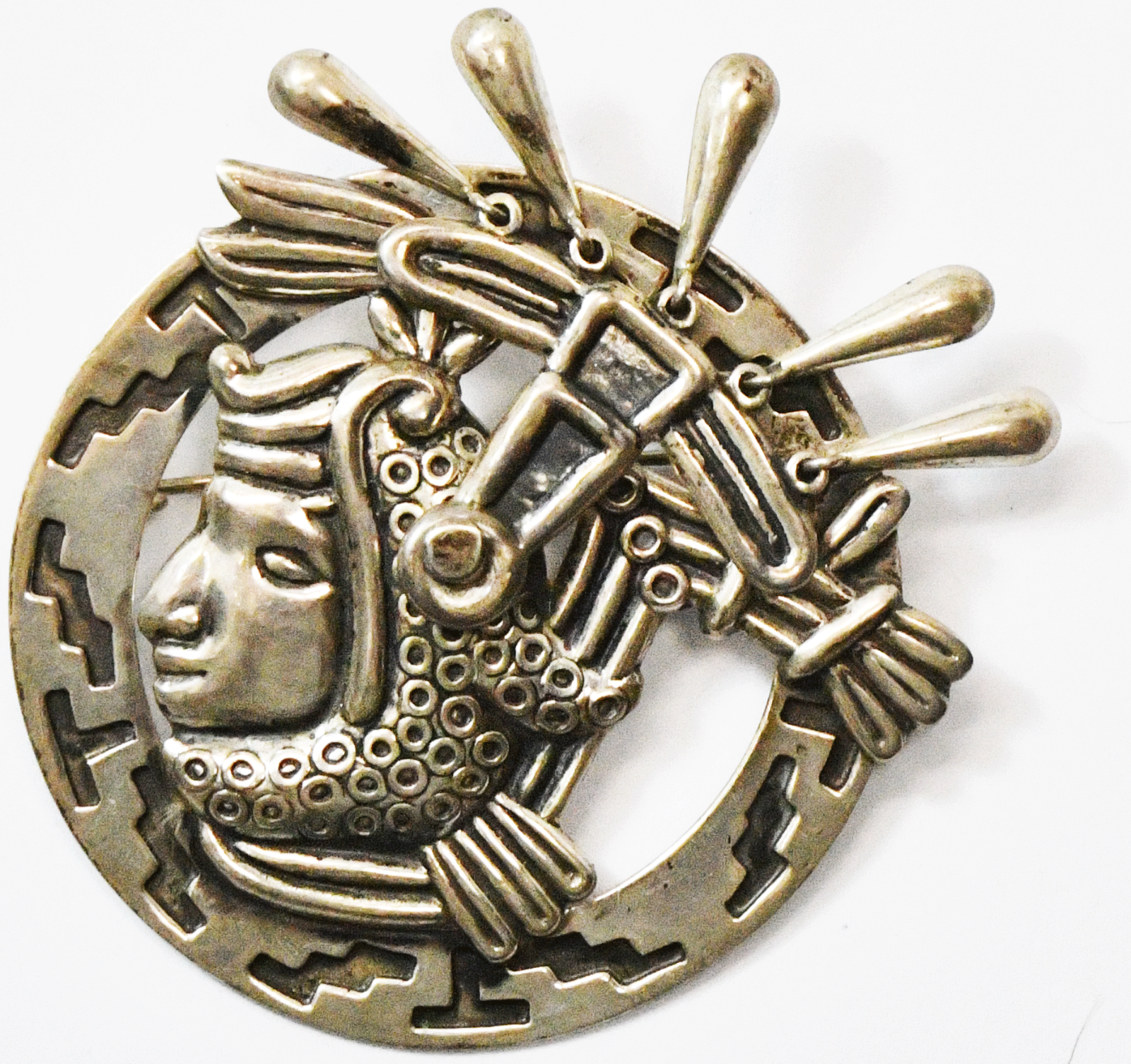 Sterling CCC Aztec Round Brooch Pin Rotating Dangle 56mm