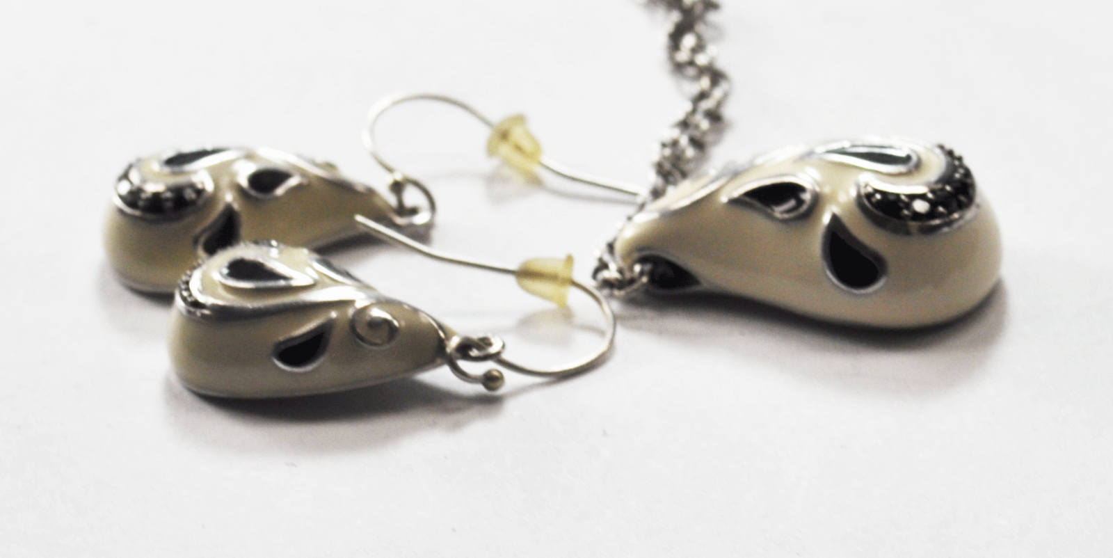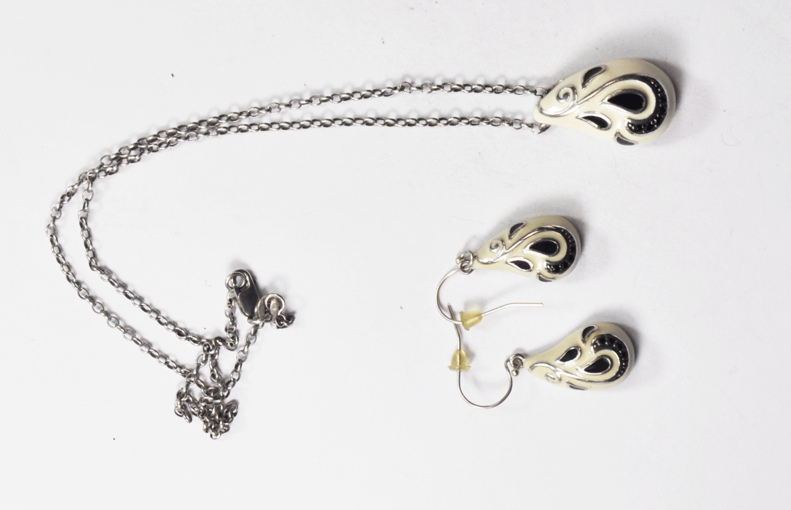 Sterling EMA Enamel Black Diamond 34mm Earrings & 26mm Pendant Set 18" Necklace
