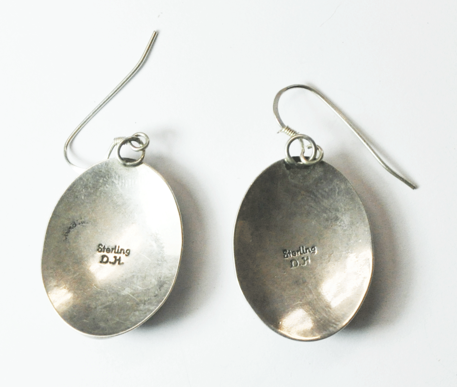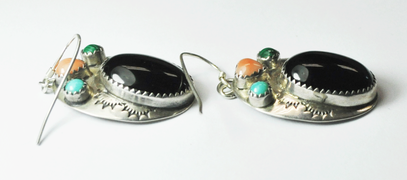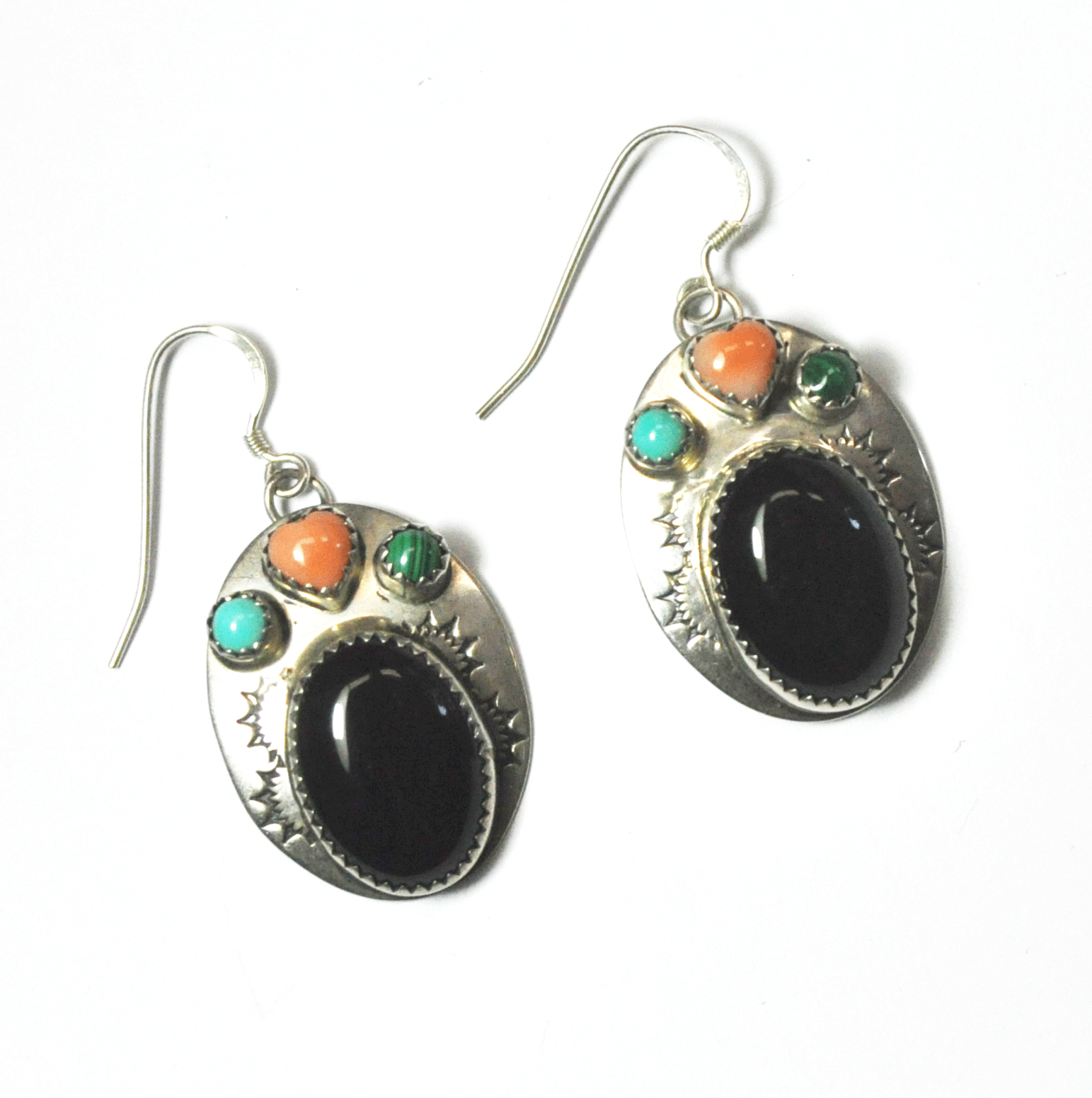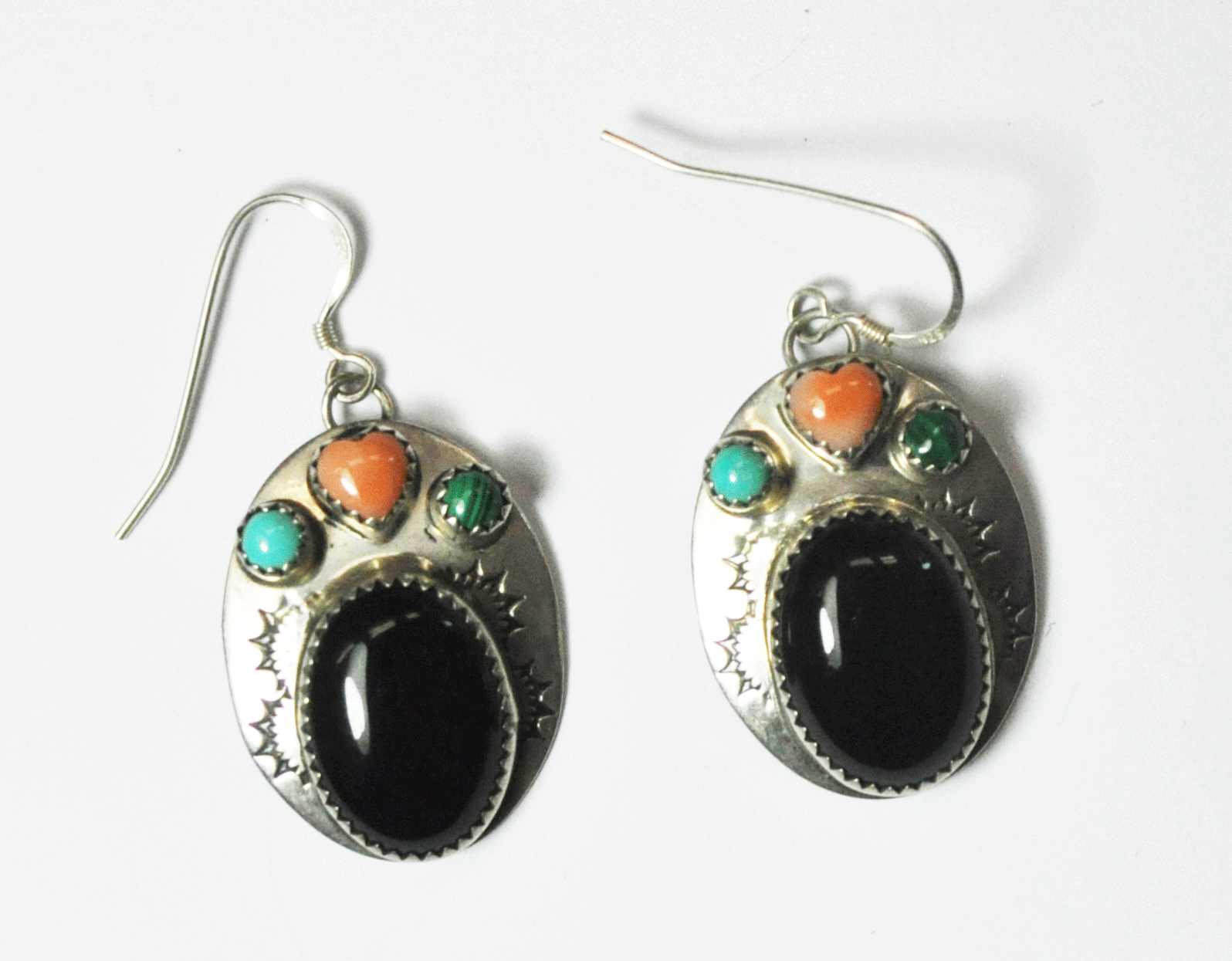 Sterling Silver Black Onyx DH Heart Multi Stone Oval Earrings Hook 1-3/4" x 22mm