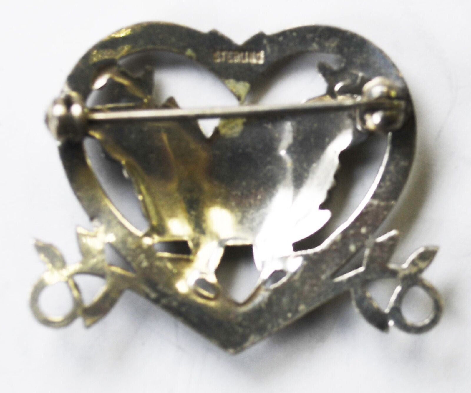Sterling Silver Dove Inside Heart Floral Vine Brooch Pin 33mm x 27mm