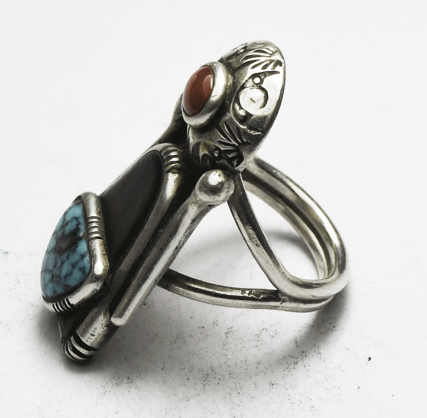 Sterling Silver Eagle Stamp Turquoise Onyx & Coral Ring 38mm Size 8