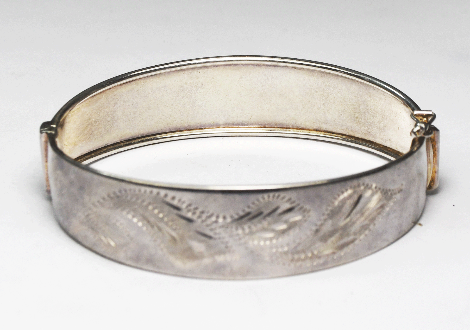 Sterling Silver Etched Leaf Floral Hinged Bangle Bracelet 16mm 7" Wrist 18g