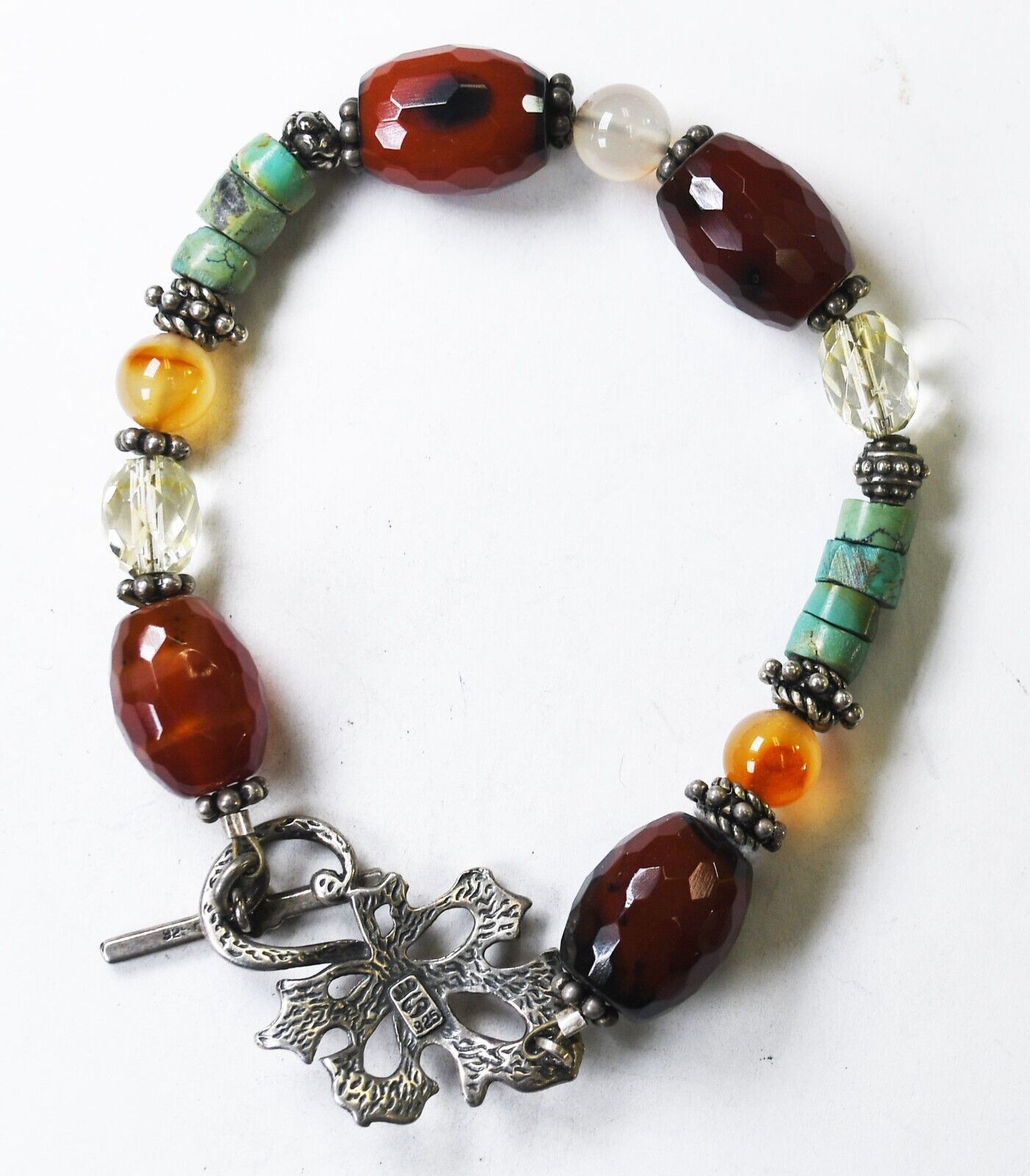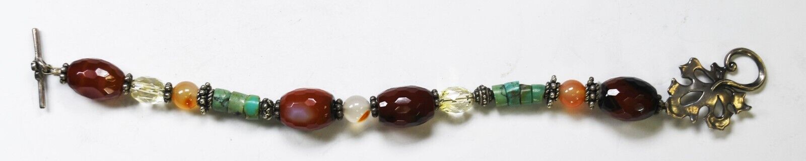 Sterling Silver Leaf Toggle Agate Turquoise Bead Bracelet 12mm 8.5"