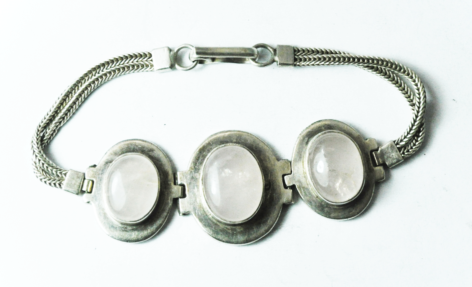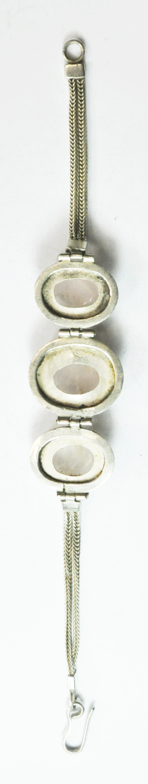 Sterling Silver Light Pink Crackled Quartz 26mm 3 Oval 2 Chain Bracelet 7.5"