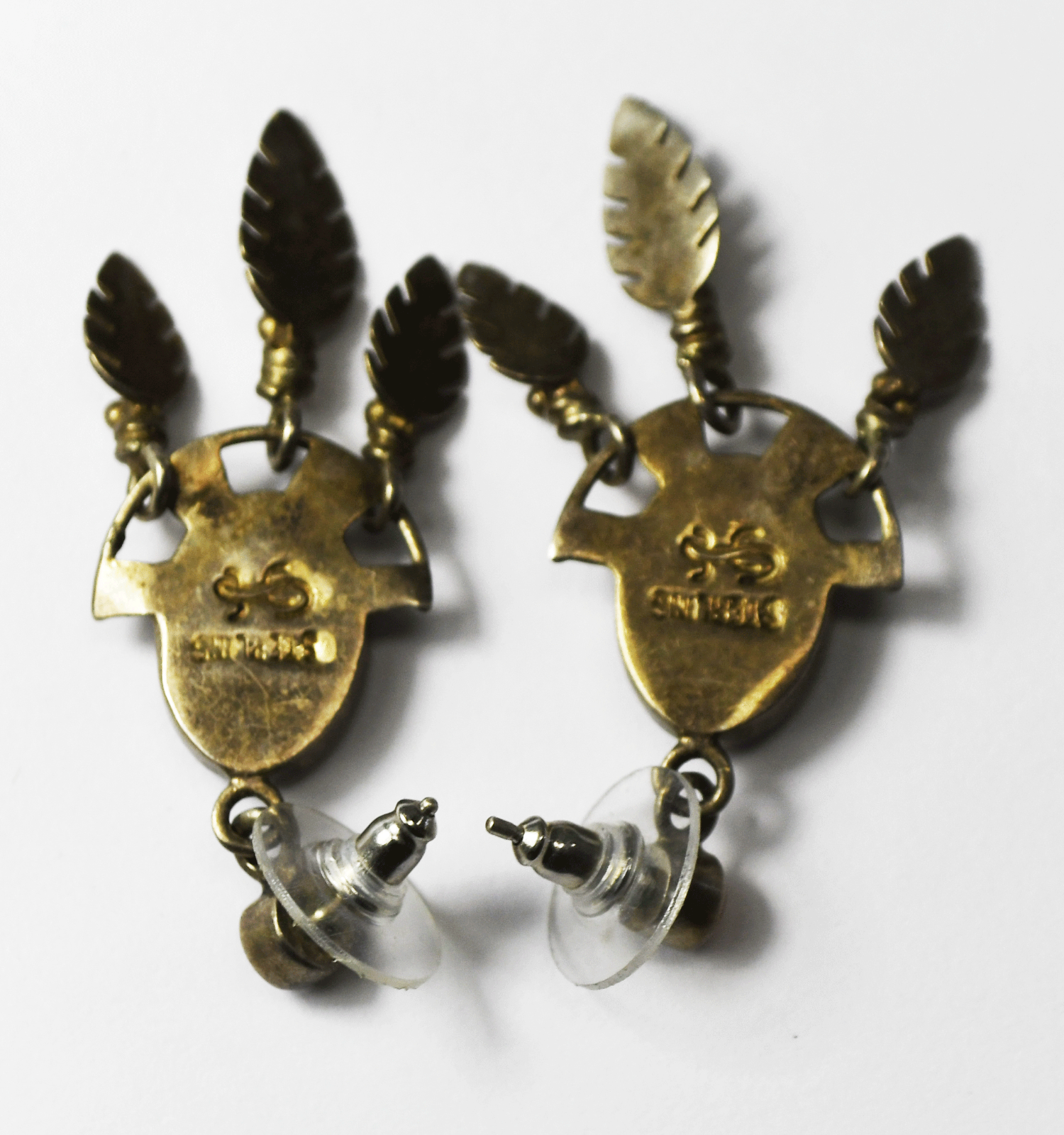 Sterling Silver Lizard Stamp Coral Inlay Earrings Feather Dangle 46mm x 17mm