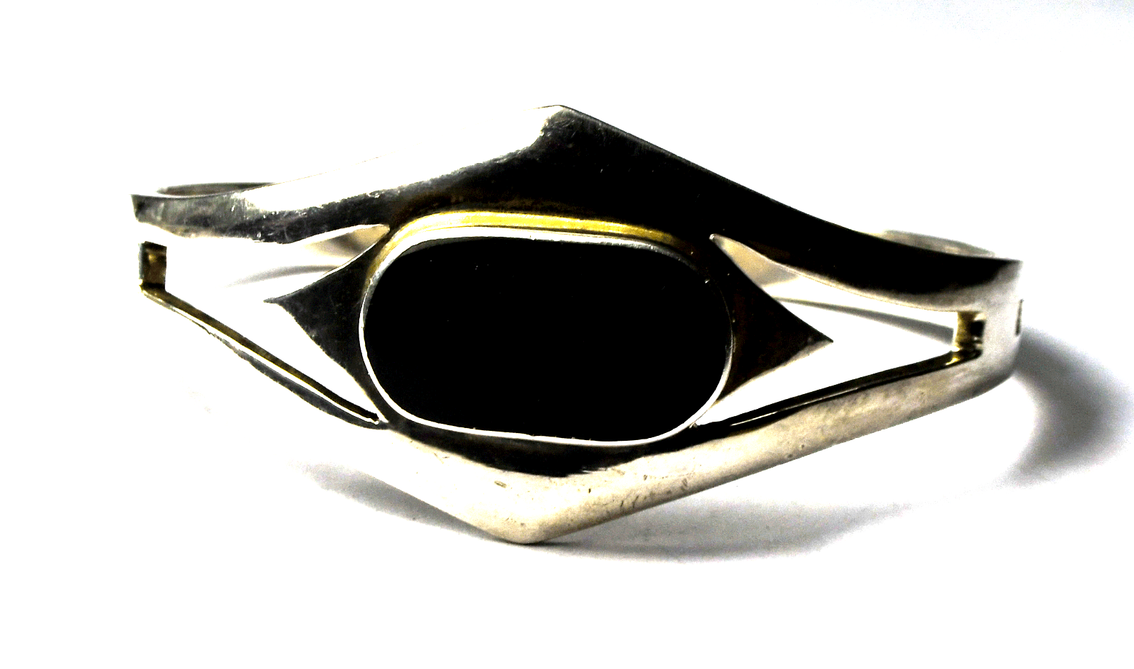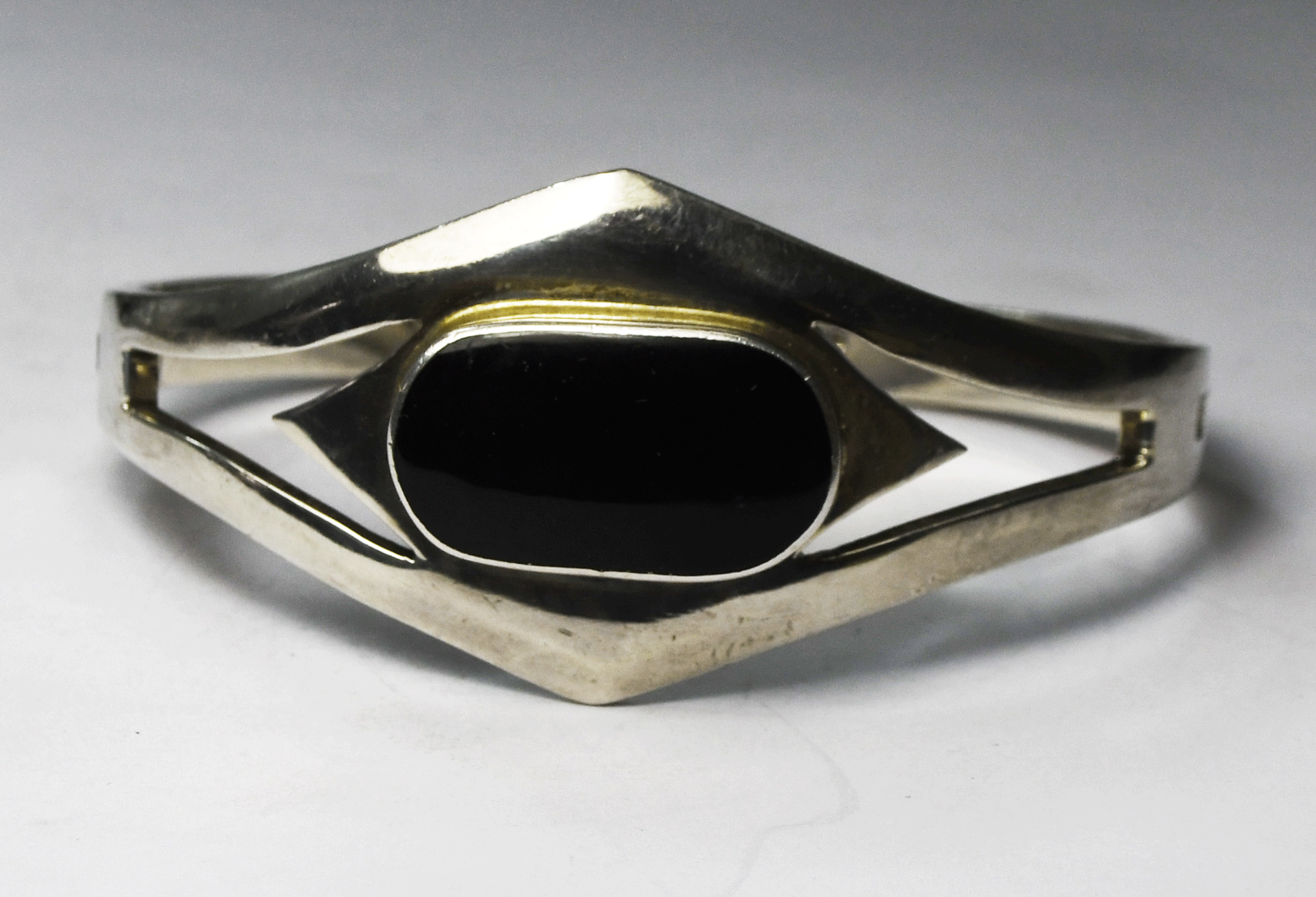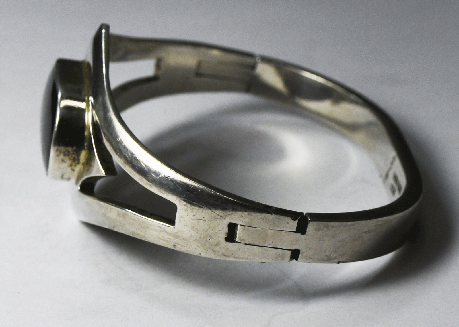 Sterling Silver Mexico Black Onyx Hinged Bangle Bracelet 7" Wrist 50g