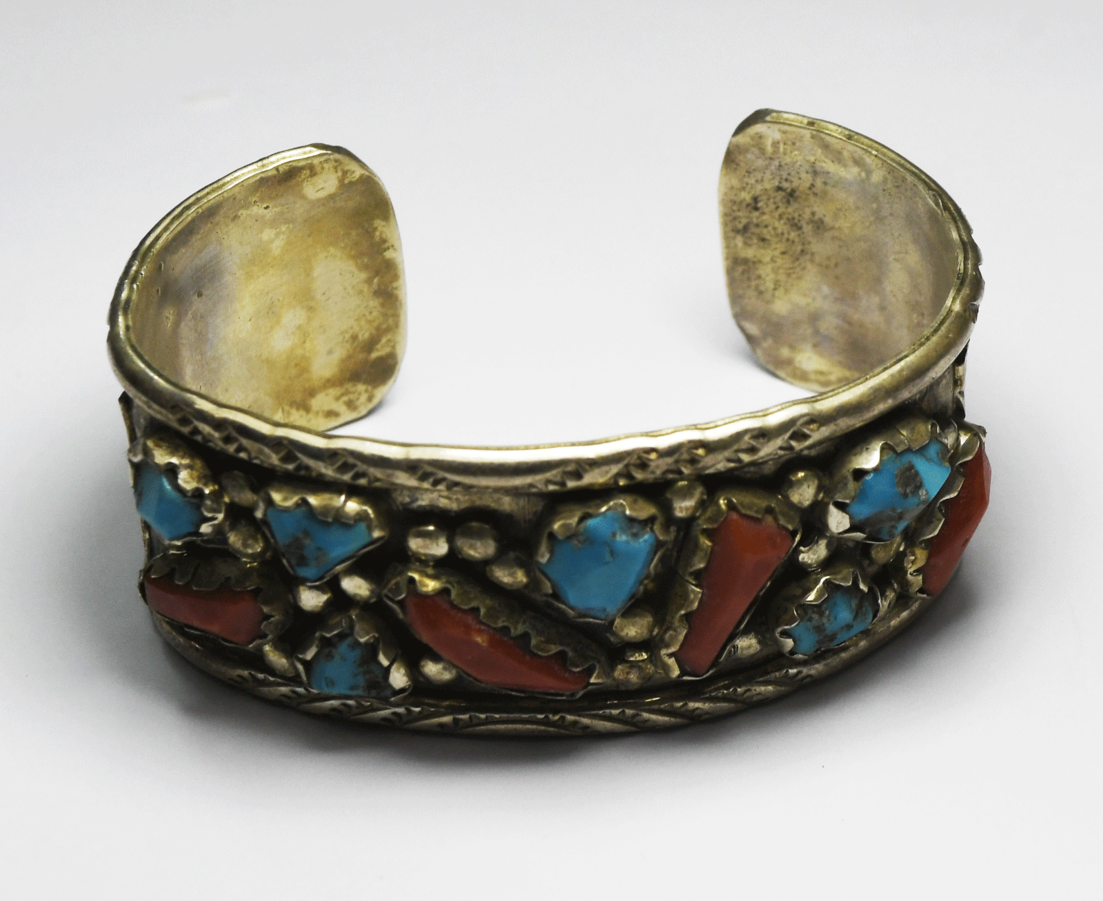 Sterling Silver ML Coral Turquoise Chunk Cuff Bracelet 25mm 6" Wrist