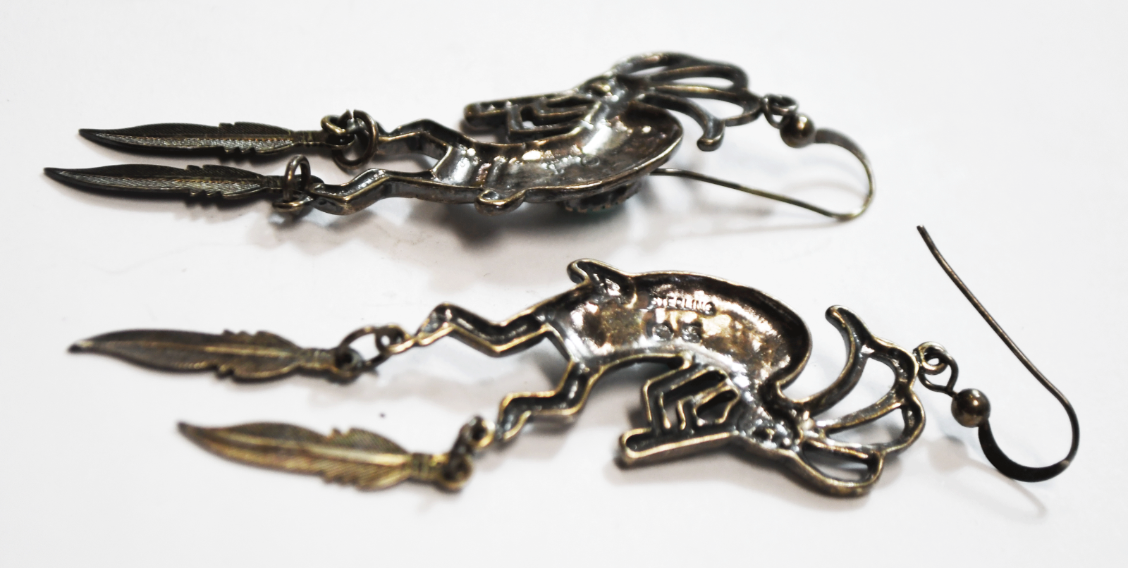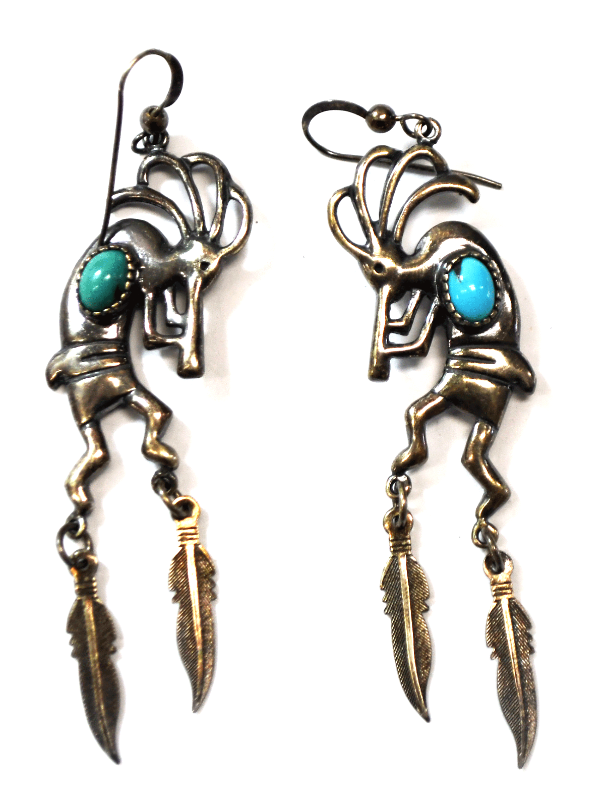 Sterling Silver Schubes Blue & Green Turquoise Kokopelli Earrings 3" Dangle
