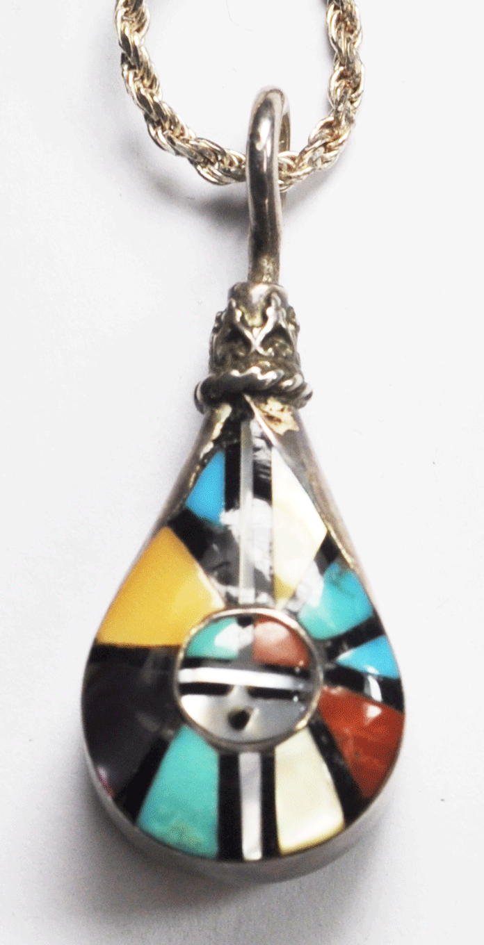 Sterling Silver Sun Inlay Teardrop Pendant Turquoise 1.5" x 16mm Rotating Bale