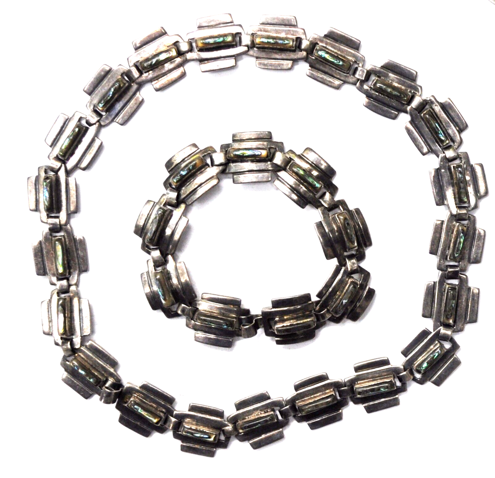 Sterling Silver Taxco JC Abalone Stripe 7" Bracelet & 15.5" Necklace 15mm