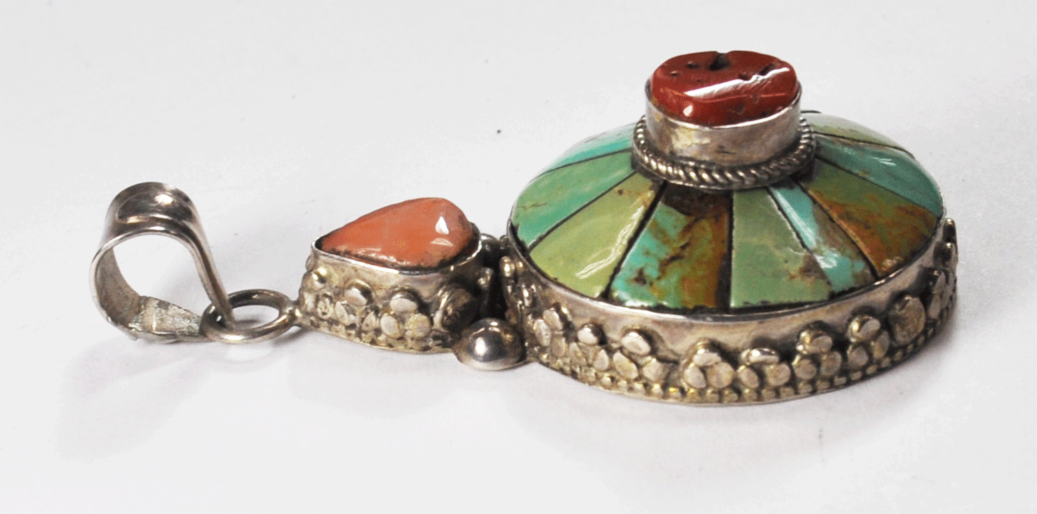 Sterling Silver Turquoise Pinwheel Coral Center 2-1/2" x 34mm Pendant 8mm Bale