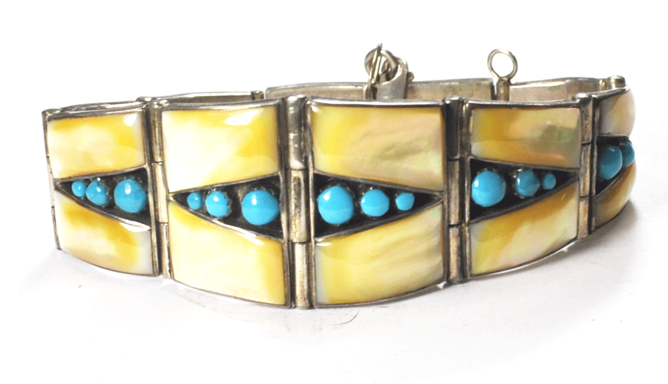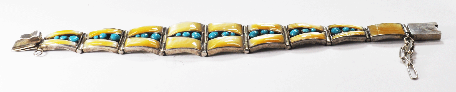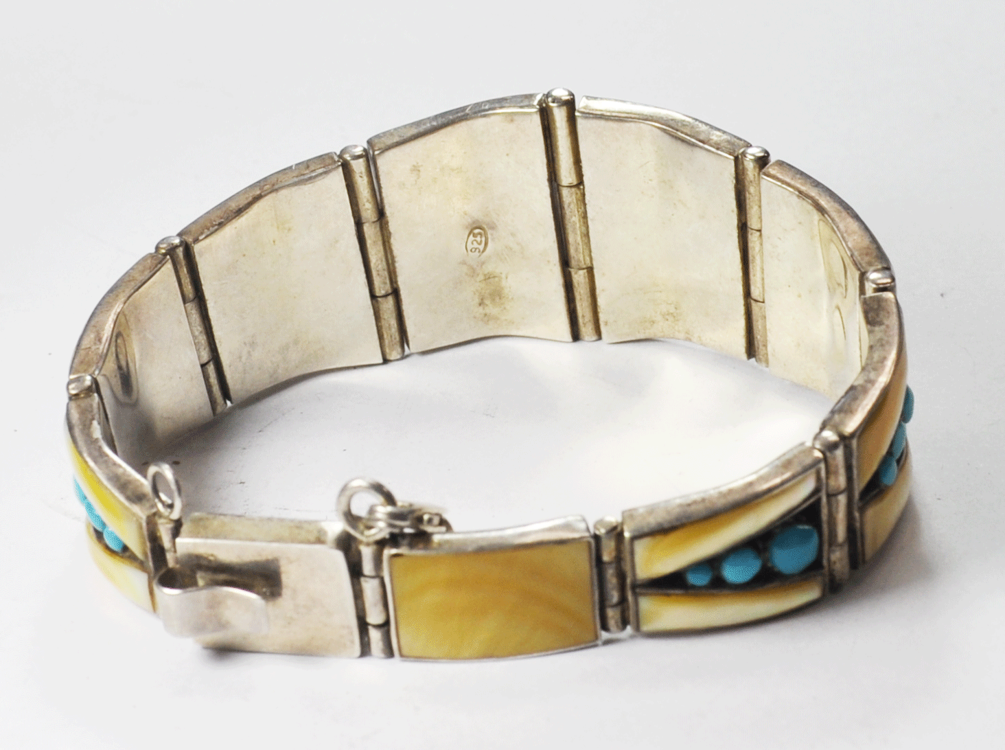 Sterling Silver Yellow MOP Turquoise Inlay Link Tapered Cuff Bracelet 37mm 8"