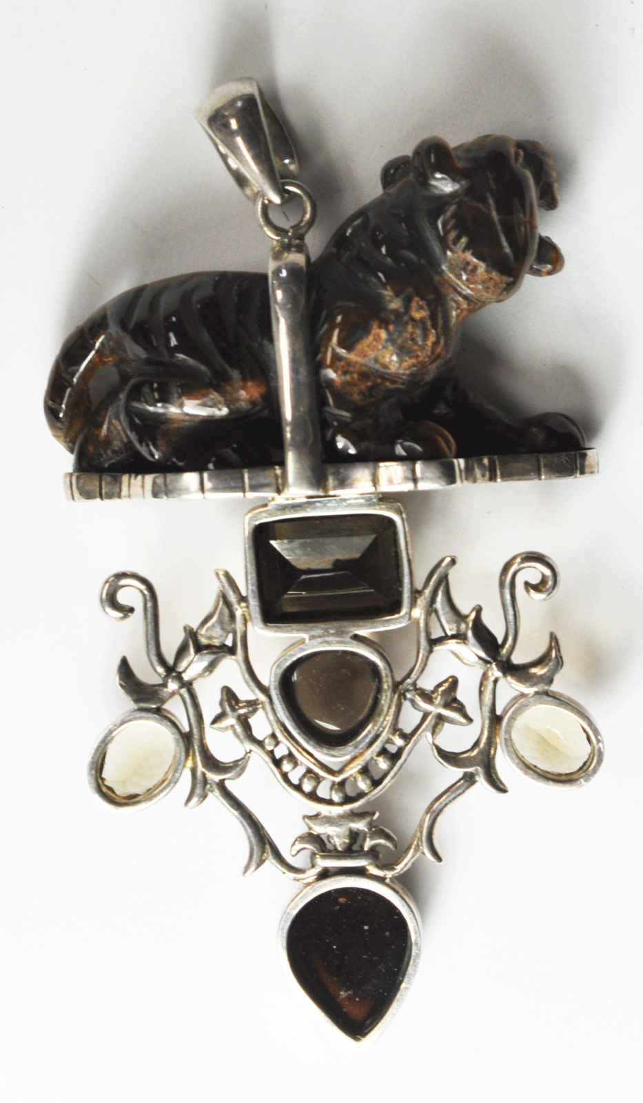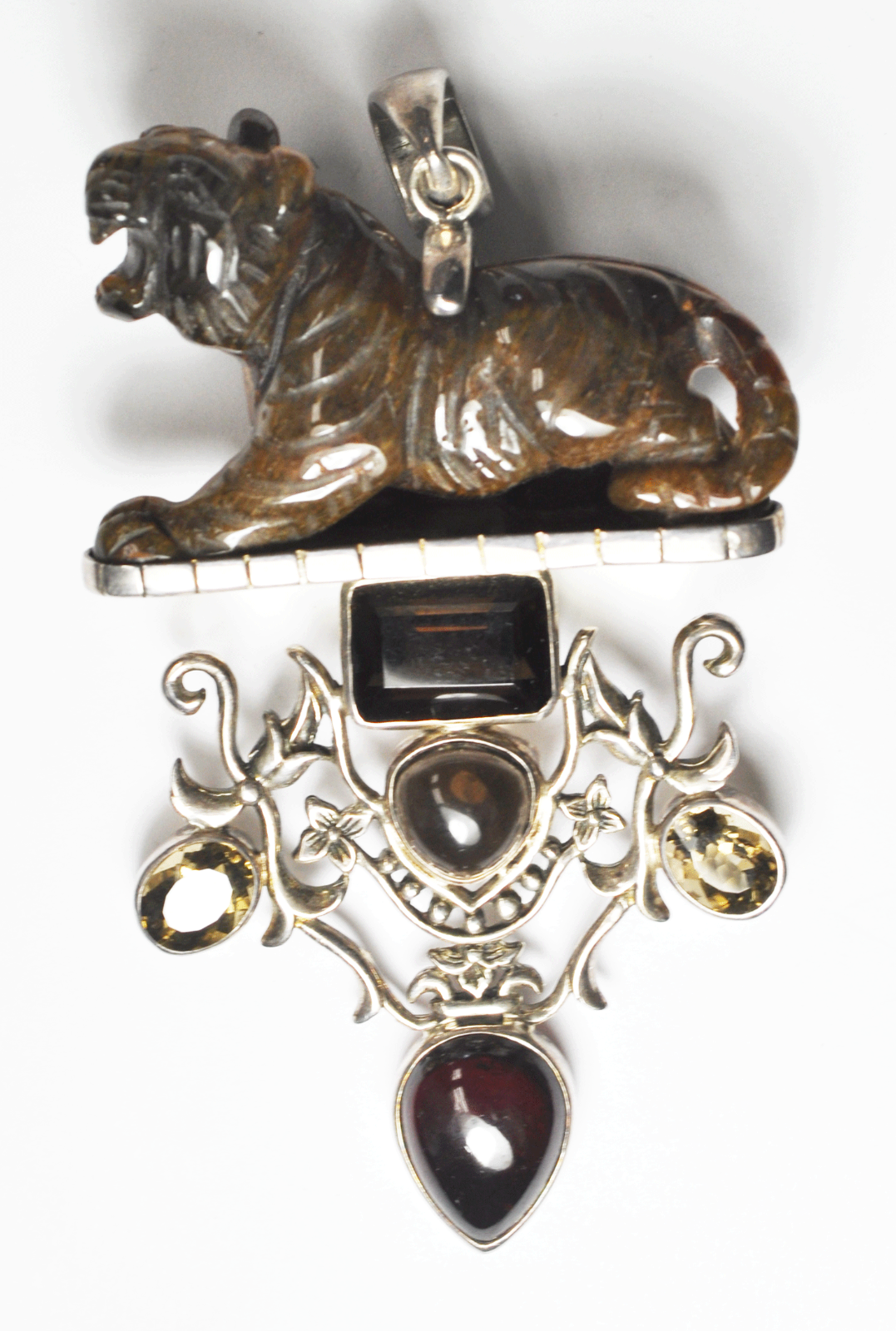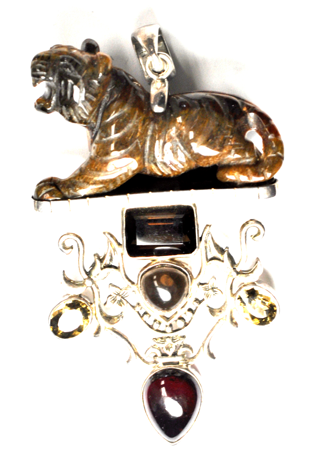 Sterling Tiger Carved Tiger's Eye Quartz Large Pendant 3-3/4" x 51mm Floral Vine