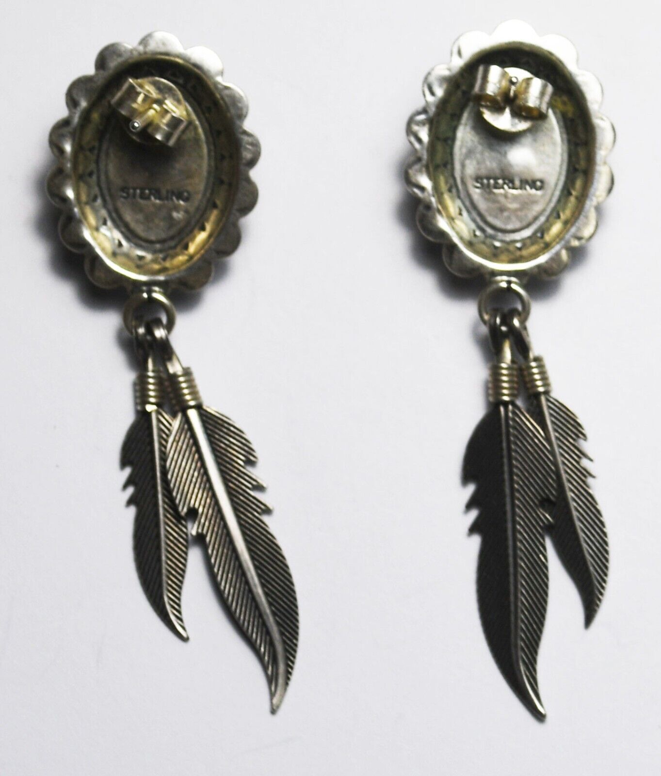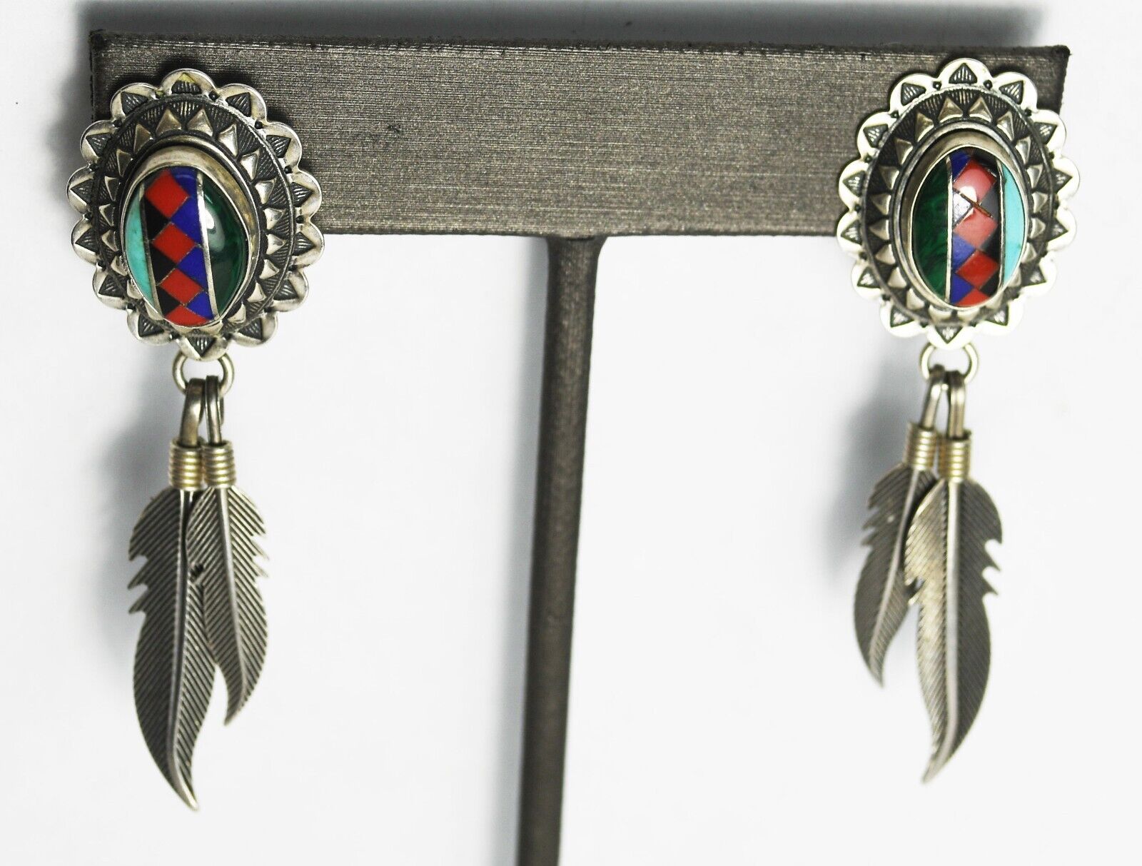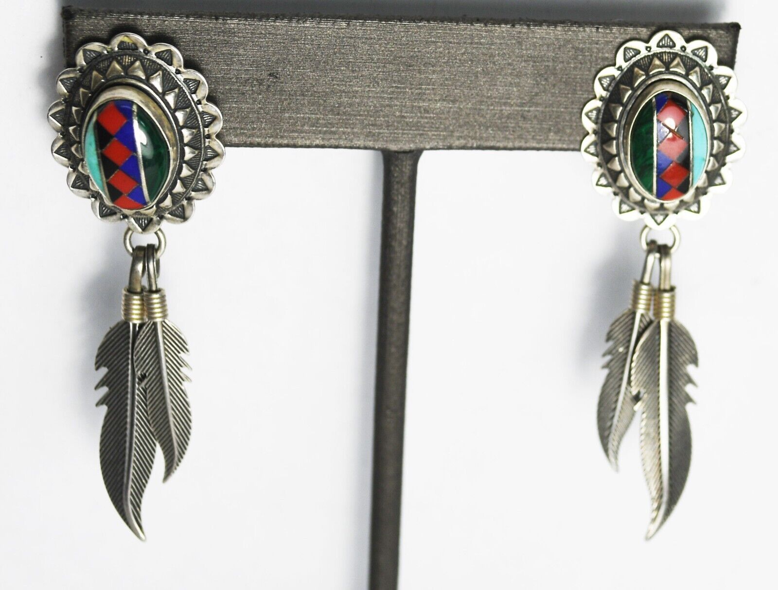 Sterling Turquoise Malachite Lapis Onyx Jasper Feather Earrings 55mm x 17mm