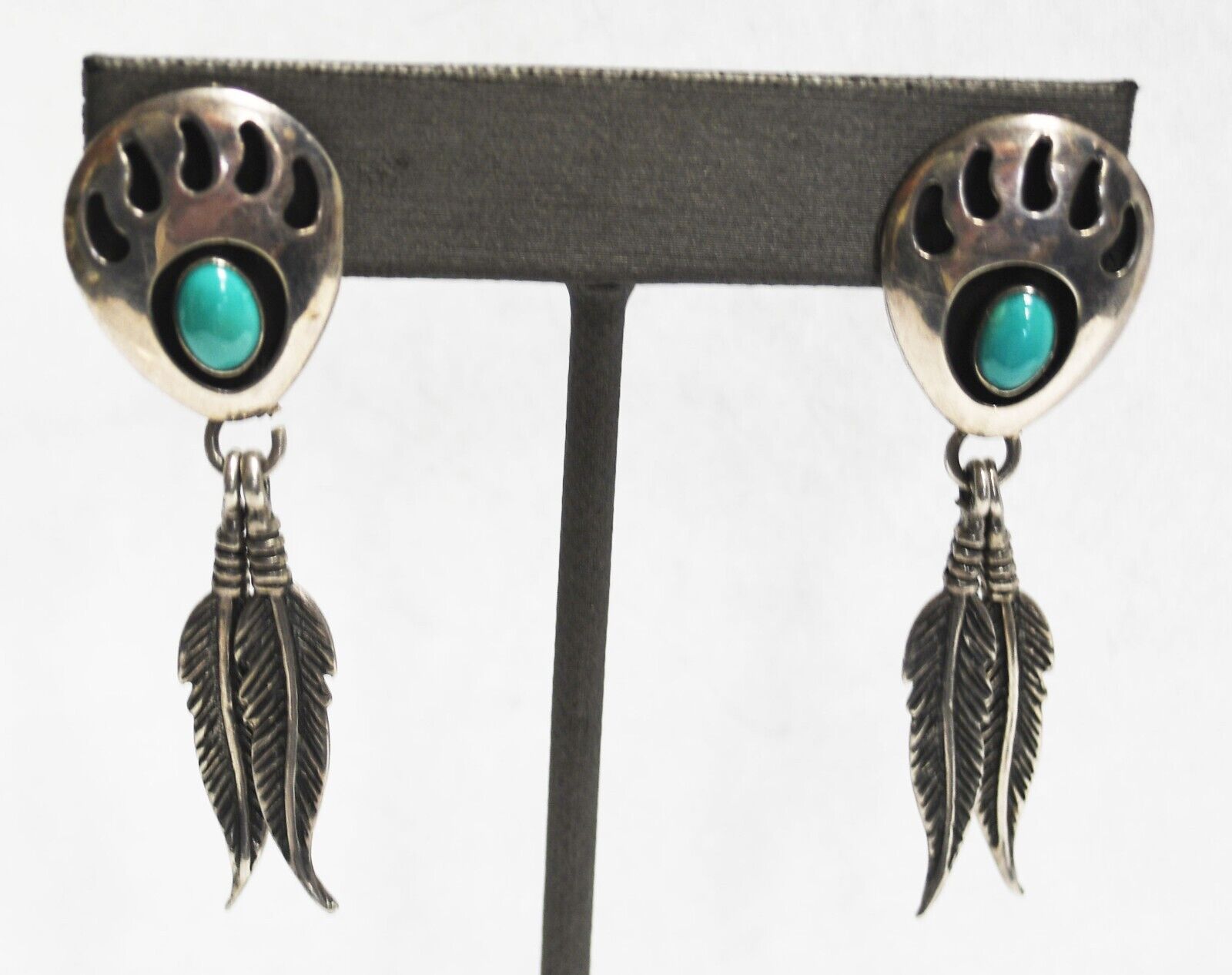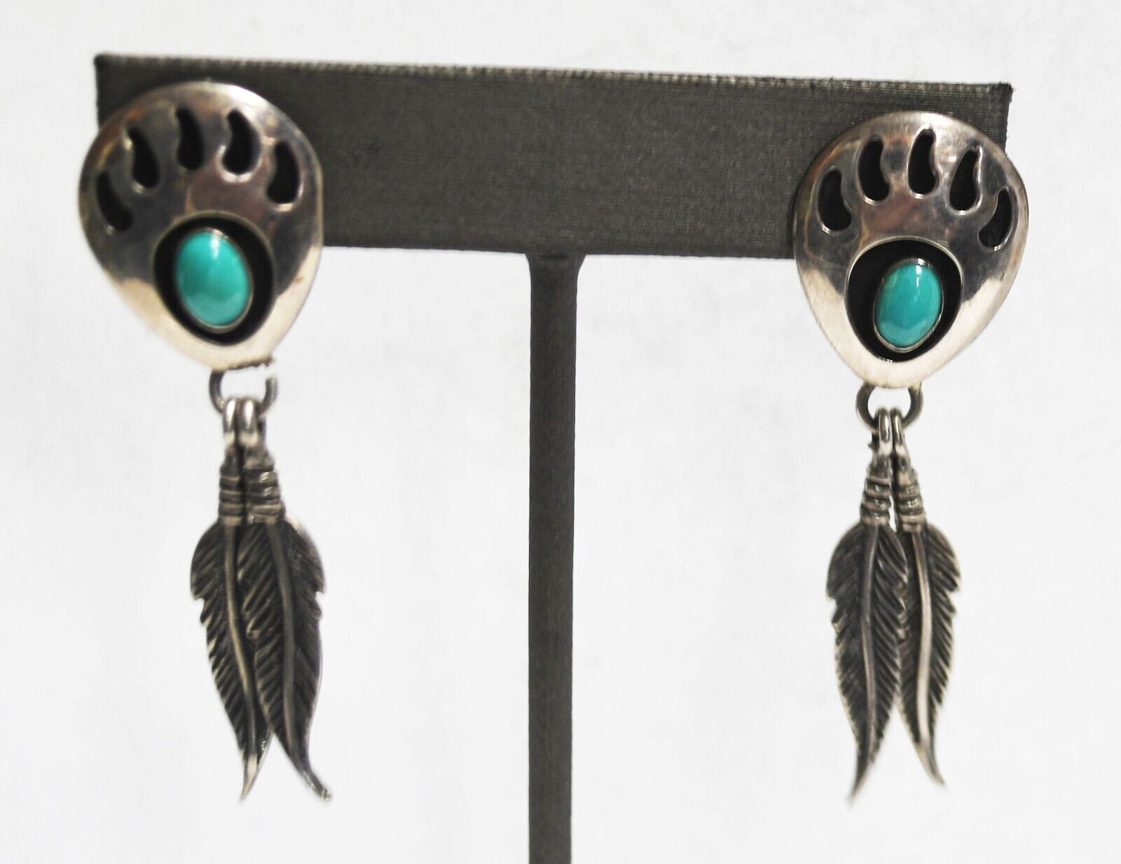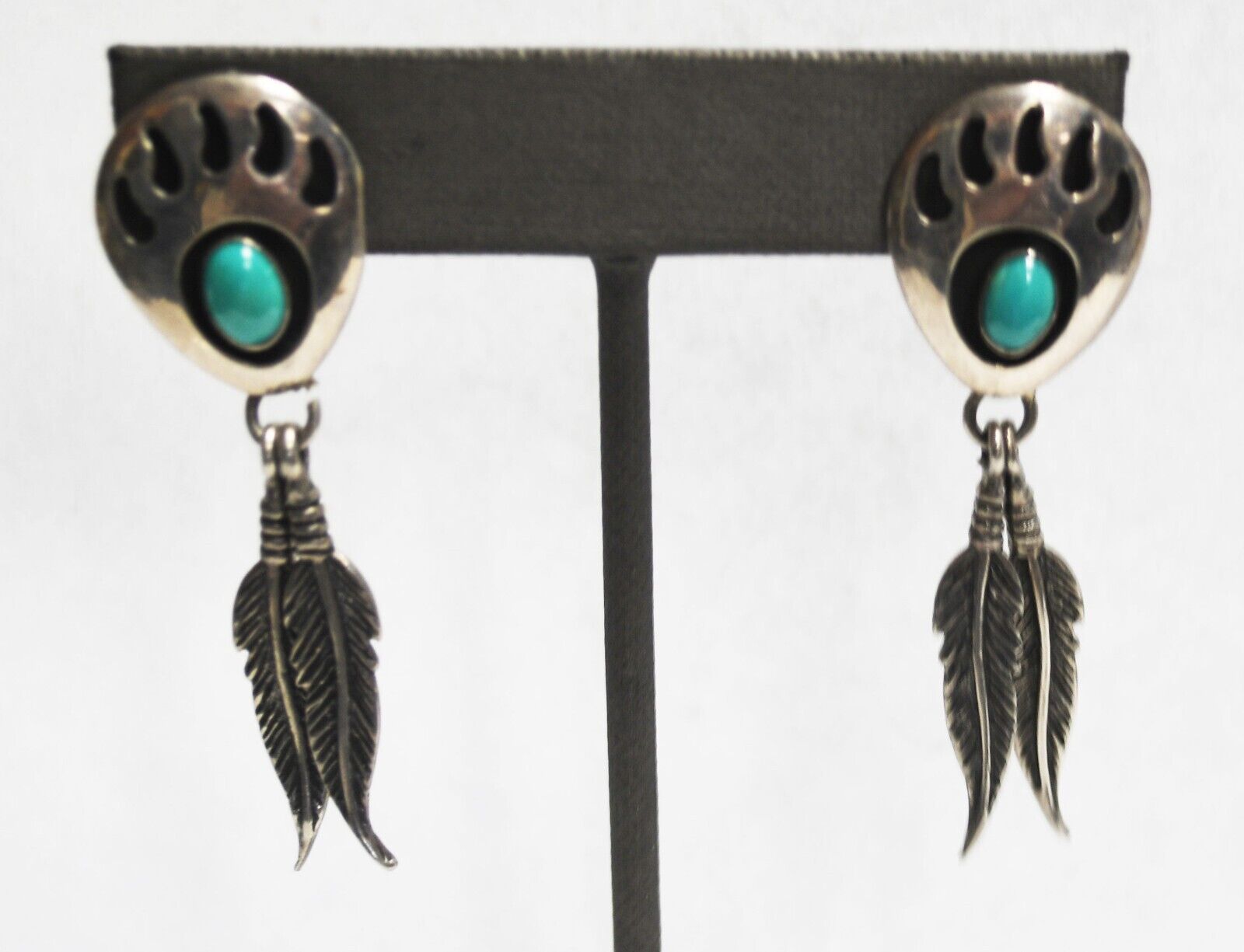 Sterling Turquoise Shadow Box Bear Claw Feather Dangle Earrings 17mm x 55mm