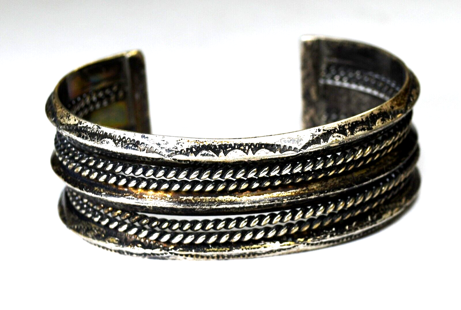 Sterling Vintage Tahe Signed 7 Part Etched Rays Cuff 22mm Bracelet 6.5" Wrist