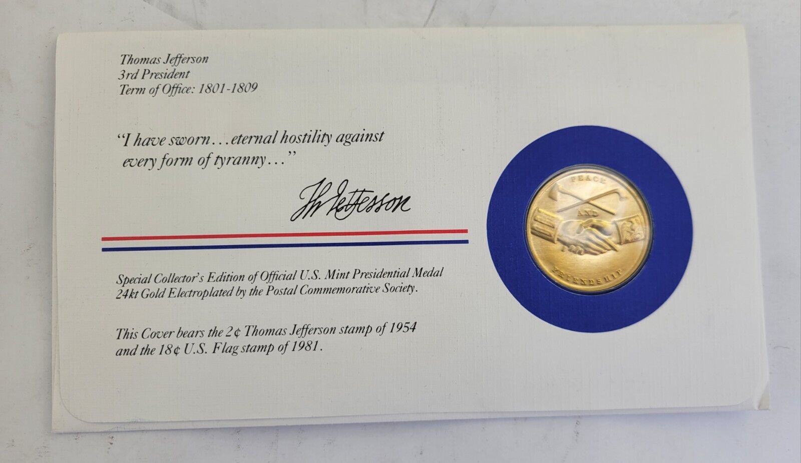 T Jefferson Presidential Covers Medal Postal Commemorative Society Gold Plated